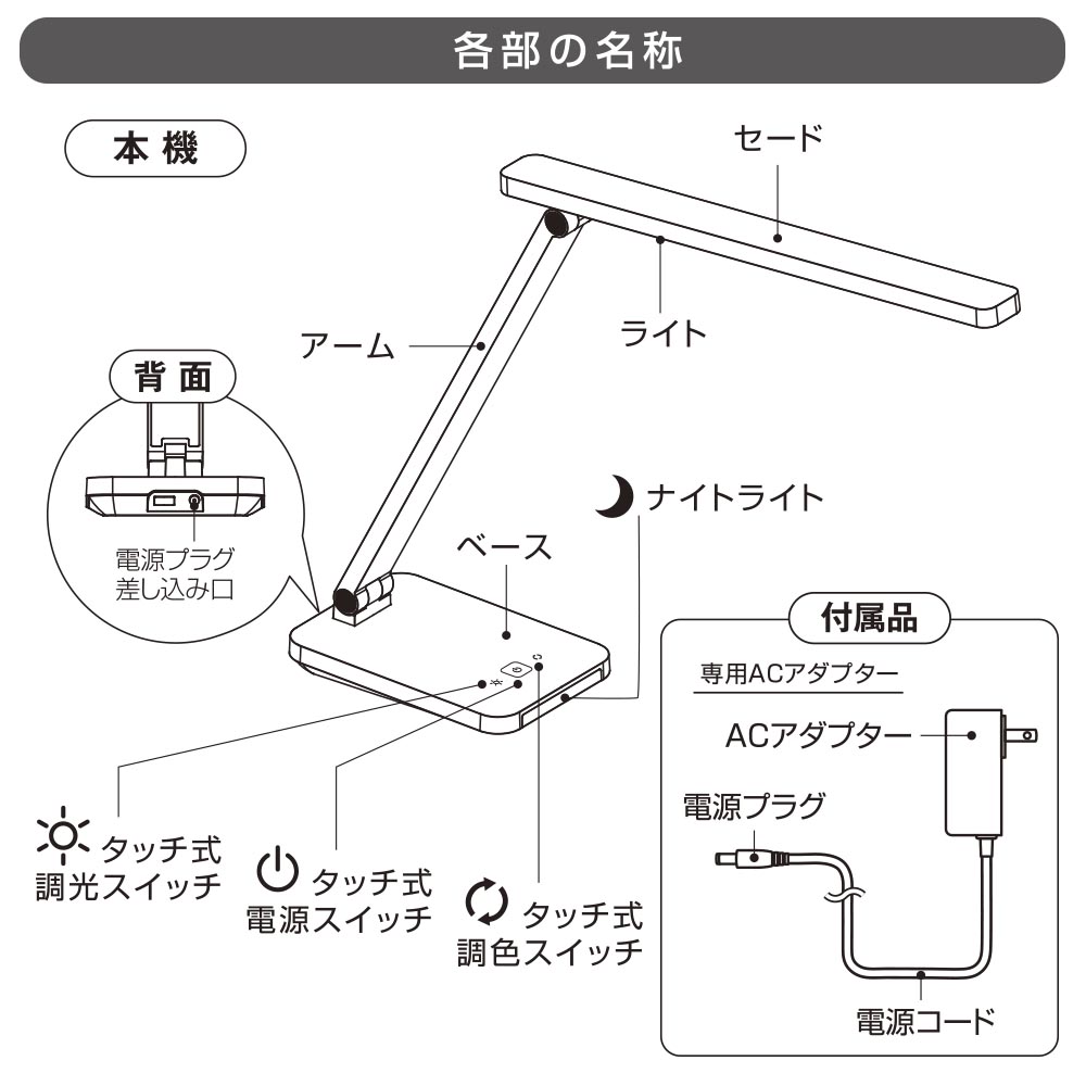 - ● タッチ式4段階調光・3段階調色(白色/昼光色/電球色)