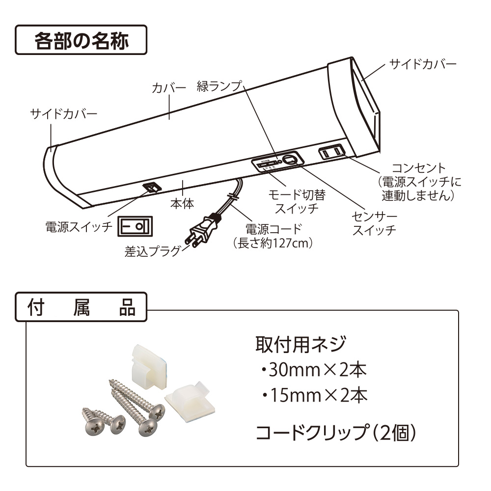 ■ 付属品:取付用ネジ(30mm×2本、15mm×2本)、コードクリップ(2個)