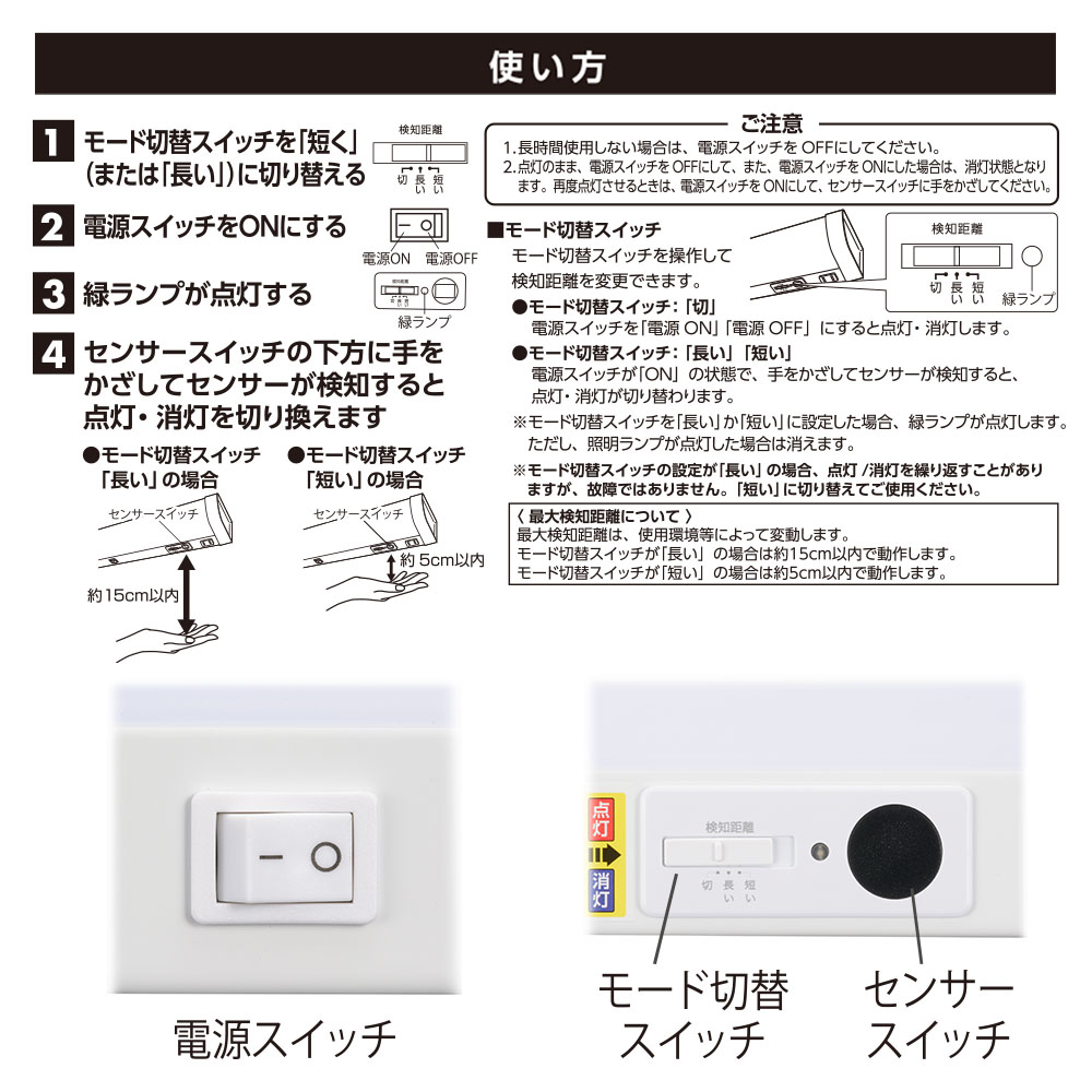 - ● センサー検知距離を変更できるモード切替スイッチ付き、検知距離:短い…約5cm、長い…約15cm