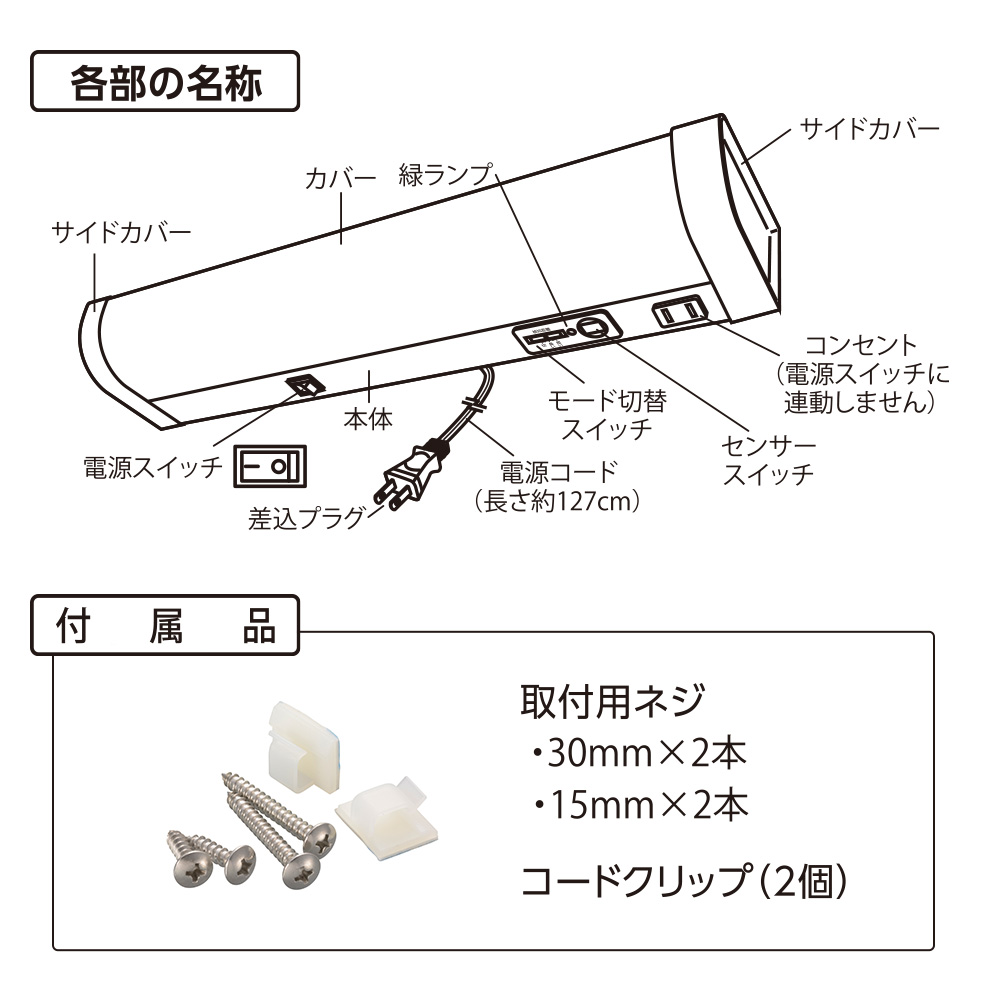 ■ 付属品:取付用ネジ(30mm×2本、15mm×2本)、コードクリップ(2個)