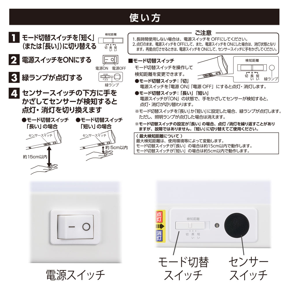 - ● センサー検知距離を変更できるモード切替スイッチ付き、検知距離:短い…約5cm、長い…約15cm