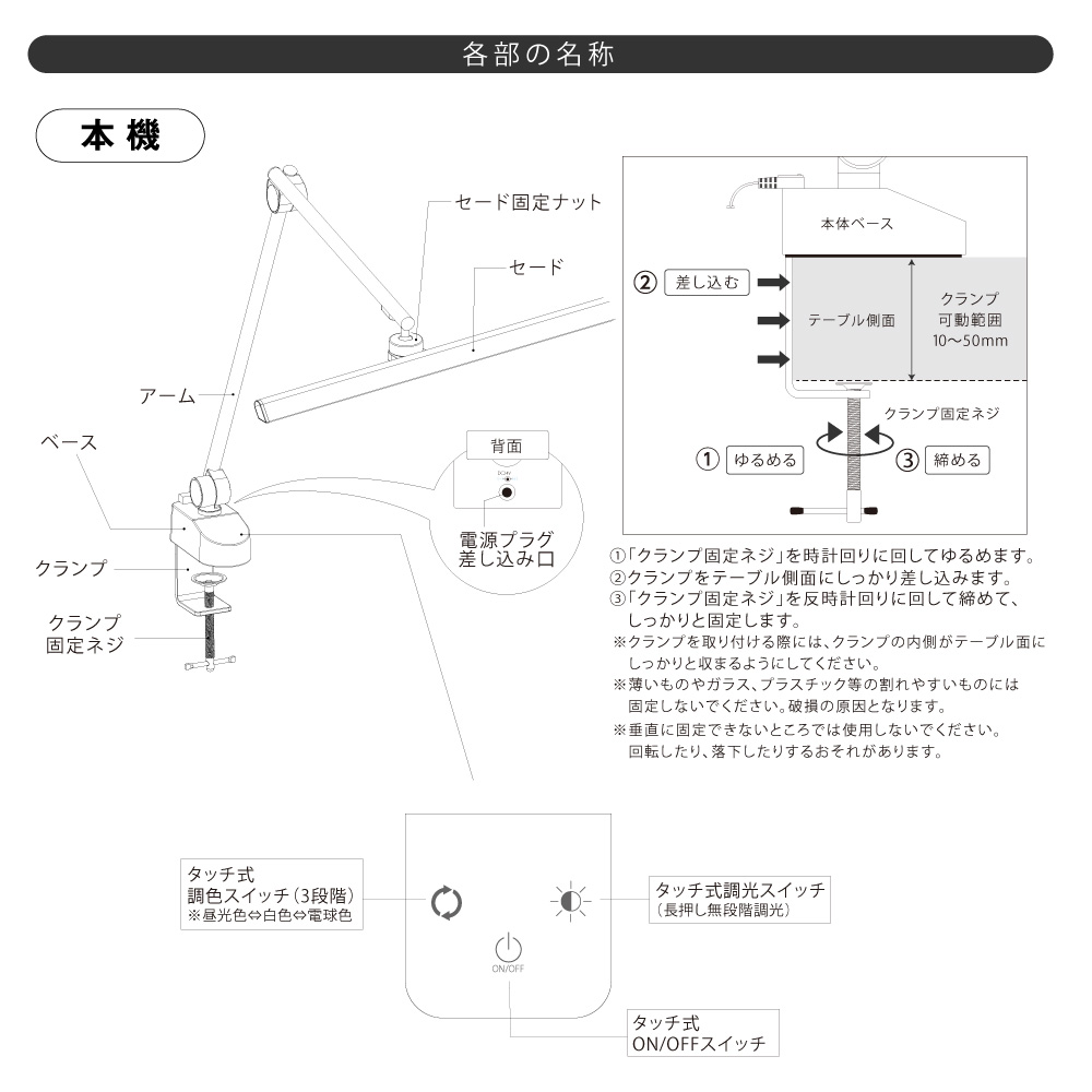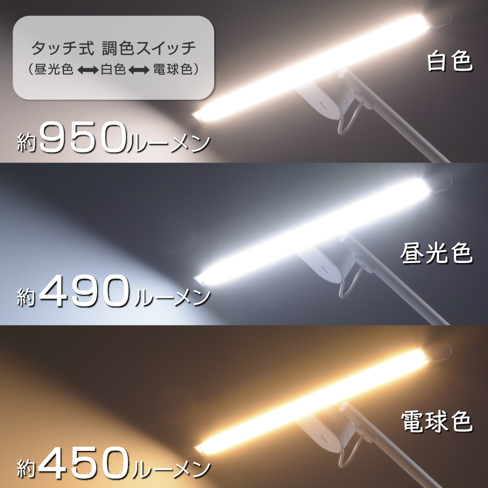 - ● タッチ式無段階調光・3段階調色(白色/昼光色/電球色)