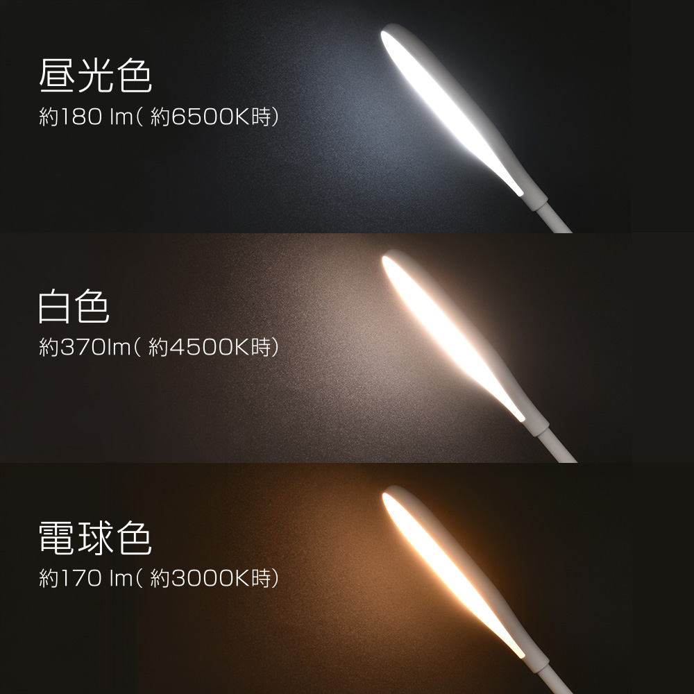 ■ 全光束:約180 lm(約6500K時)昼光色、約370 lm(約4500K時)白色、約170 lm(約3000K時)電球色