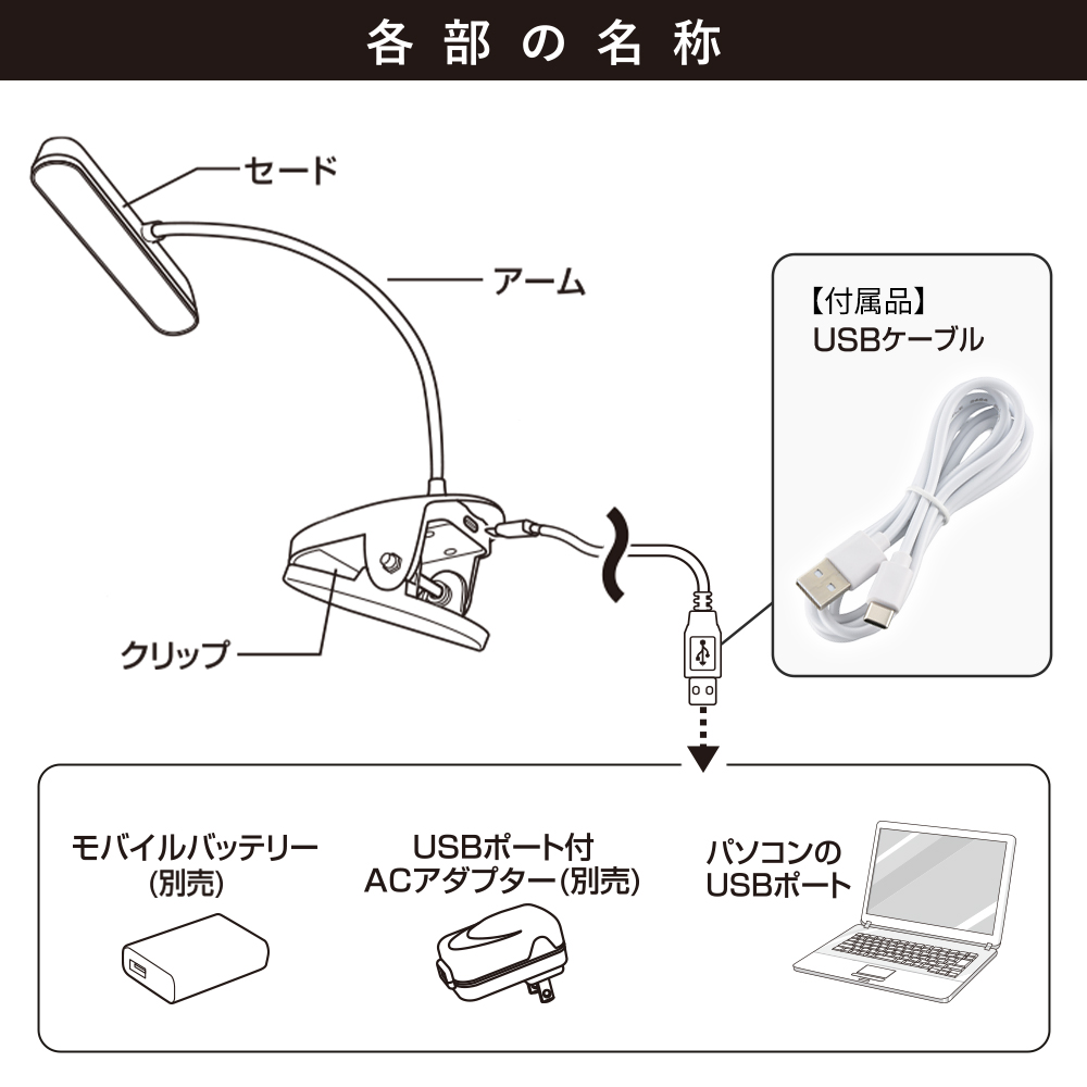 ■ 本体寸法:セード…(約)幅180×高さ27×奥行25mm、アーム…約304mm、クリップ…(約)幅53×高さ80×奥行114mm