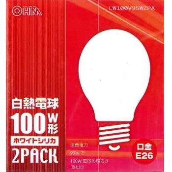白熱電球 E26 ホワイト 100W形 2個入 [品番]06-2585