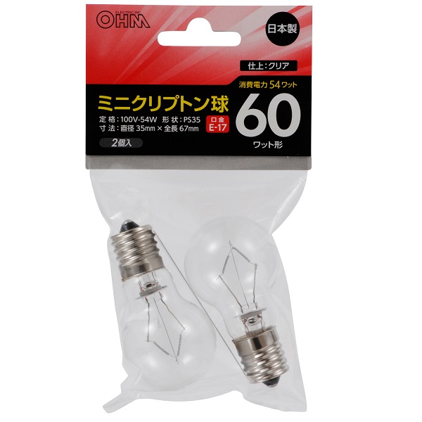 ■ 定格:100V−54W ■ 形状:PS35 ■ 仕上げ:クリア ■ 直径:35mm 全高:67mm ■ 口金:E17 ■ 入数:2個