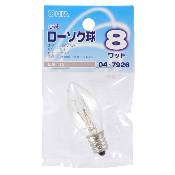 ■ 定格:100V−8W ■ 形状:C−7 ■ 口金:E12 ■ 仕上:クリア ■ サイズ:直径25×全高53mm
