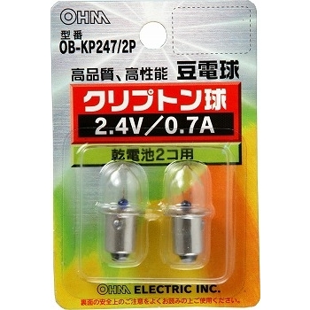 ■ クリプトン球 2.4V/0.7A ■ クリプトンガス封入で発光効率に優れ、一般球よりも明るい。 ■ 乾電池2個用。懐中ライト、常備灯など。 ■ 2個入り