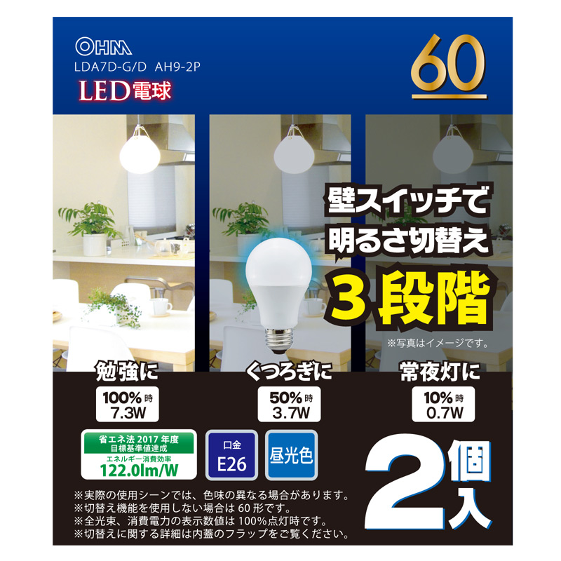 LED電球 E26 60形相当 明るさ切替 昼光色 2個入 [品番]06-0111