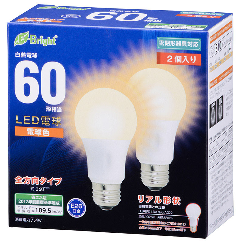 - ● 消費電力7.4Wで白熱電球60形相当の明るさ