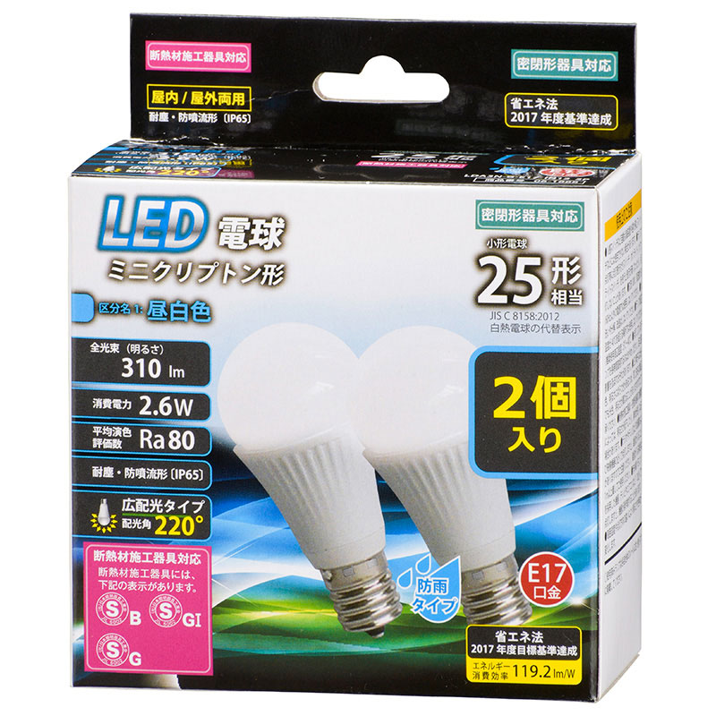 - LED電球 ミニクリプトン形 E17 25形相当 防雨タイプ 昼白色 2個入 [品番]06-1888