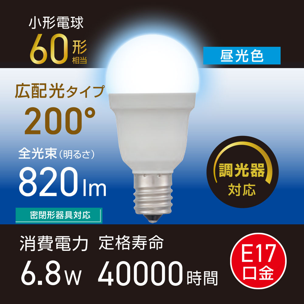 - LED電球小形 E17 60形相当 調光器対応 昼光色 [品番]06-5493