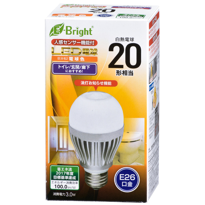 - LED電球 E26 20形相当 人感センサー 電球色 [品番]06-3115