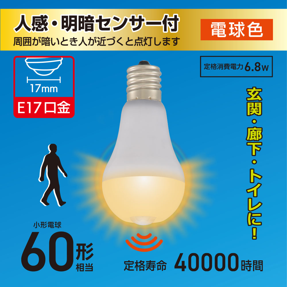 - LED電球小形 E17 60形相当 人感明暗センサー付 電球色 [品番]06-5698