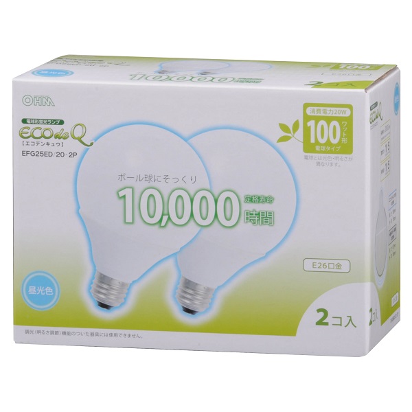 - 電球形蛍光灯 ボール形 E26 100形相当 昼光色 エコデンキュウ 2個入 [品番]04-1372