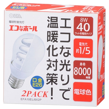 - 電球形蛍光灯 E26 40形相当 電球色 エコなボール 2個入 [品番]04-9233