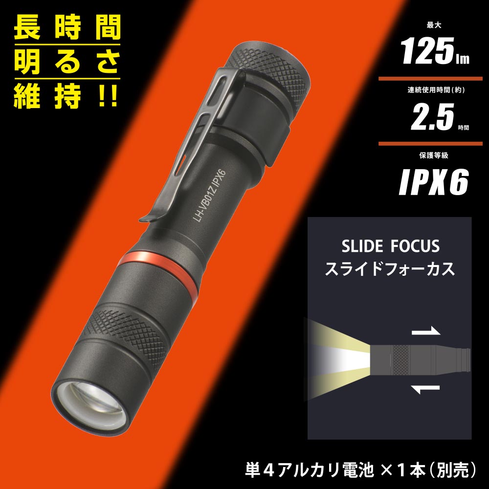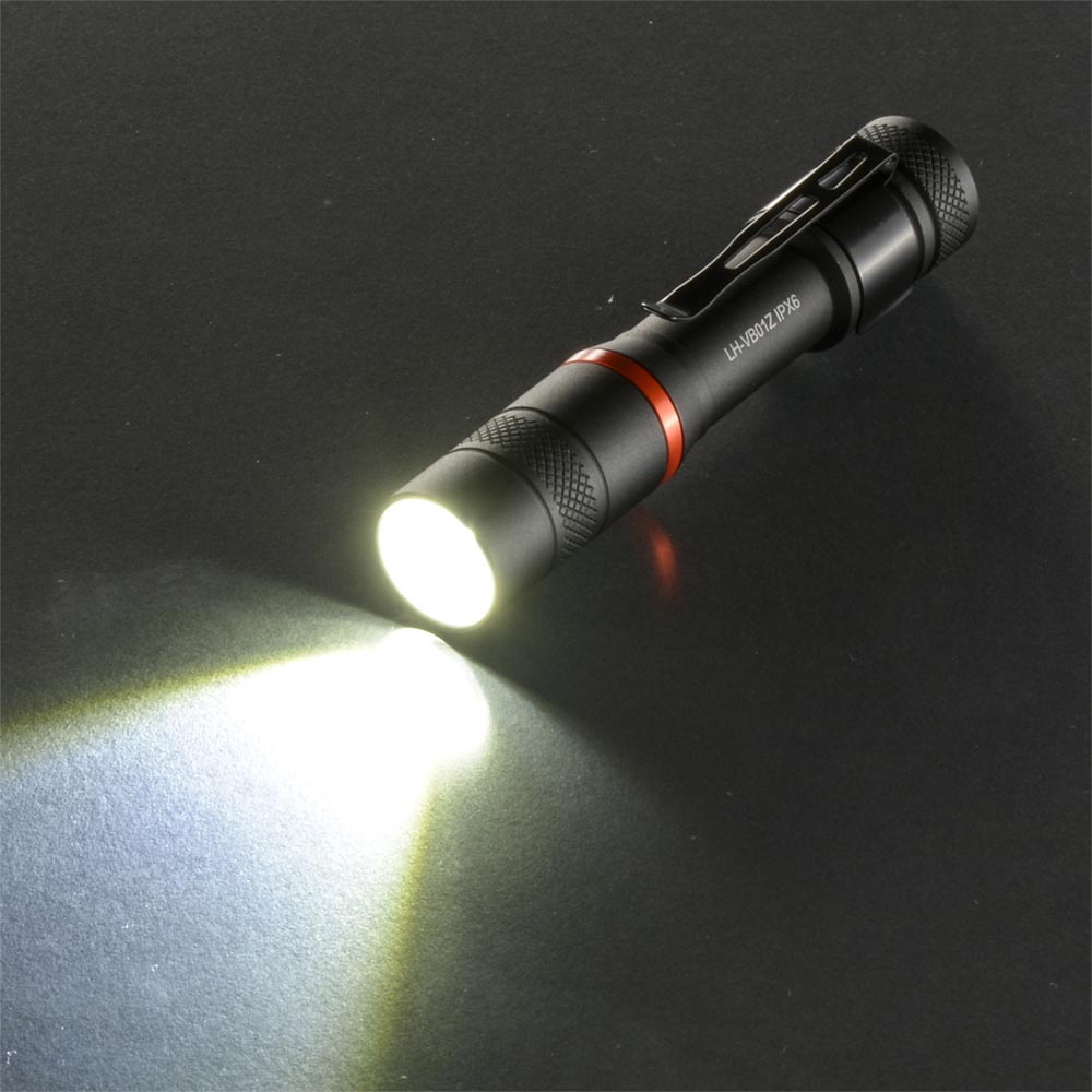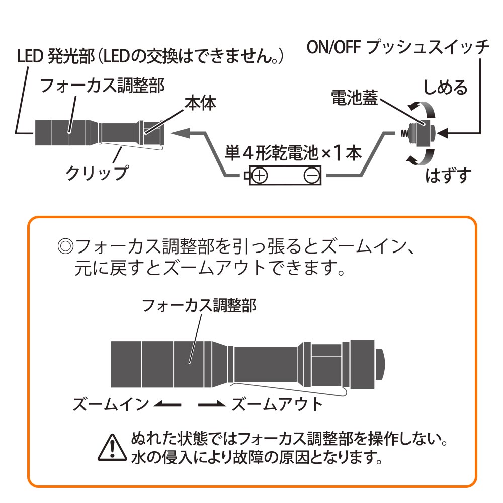 - ● スライドフォーカス機能付き電池式LEDフラッシュライト