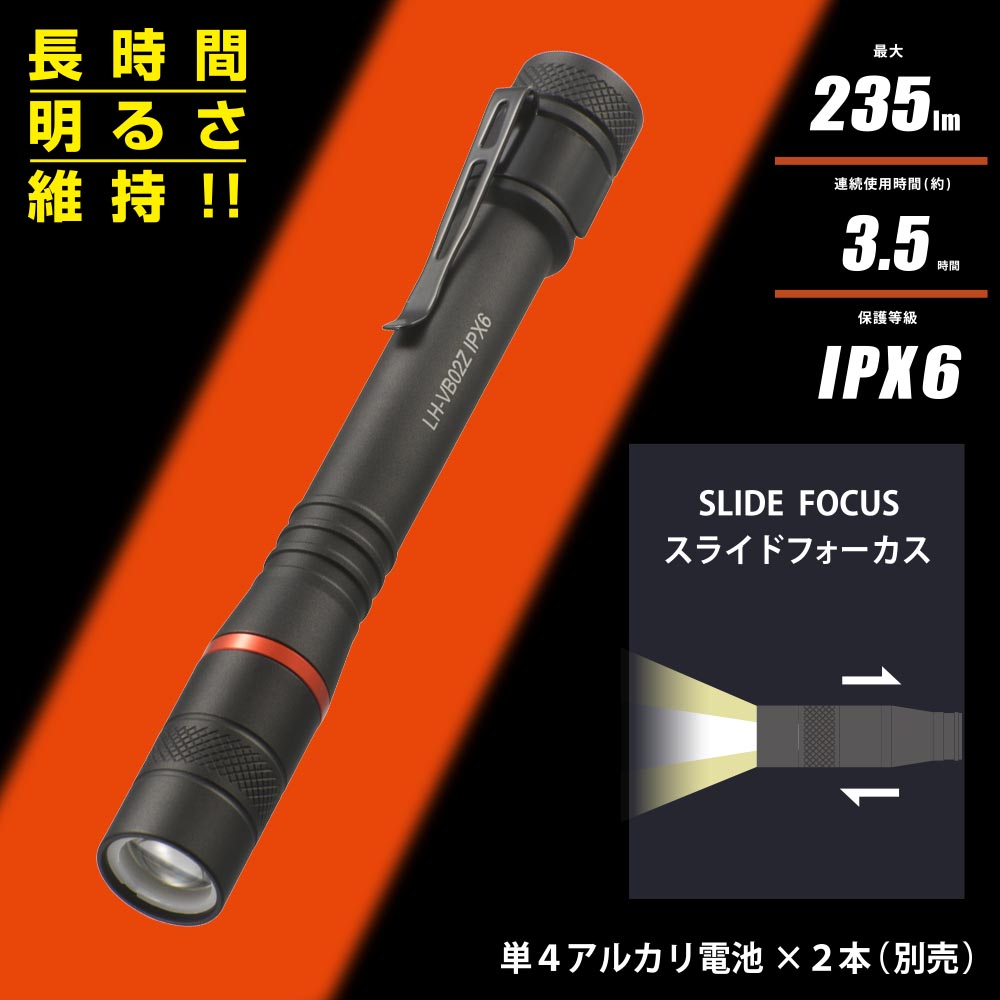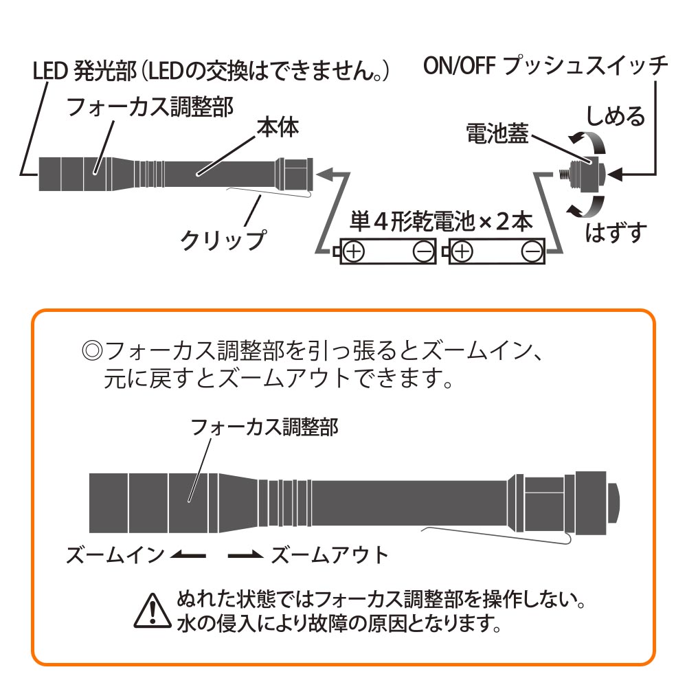 - ● スライドフォーカス機能付き電池式LEDフラッシュライト