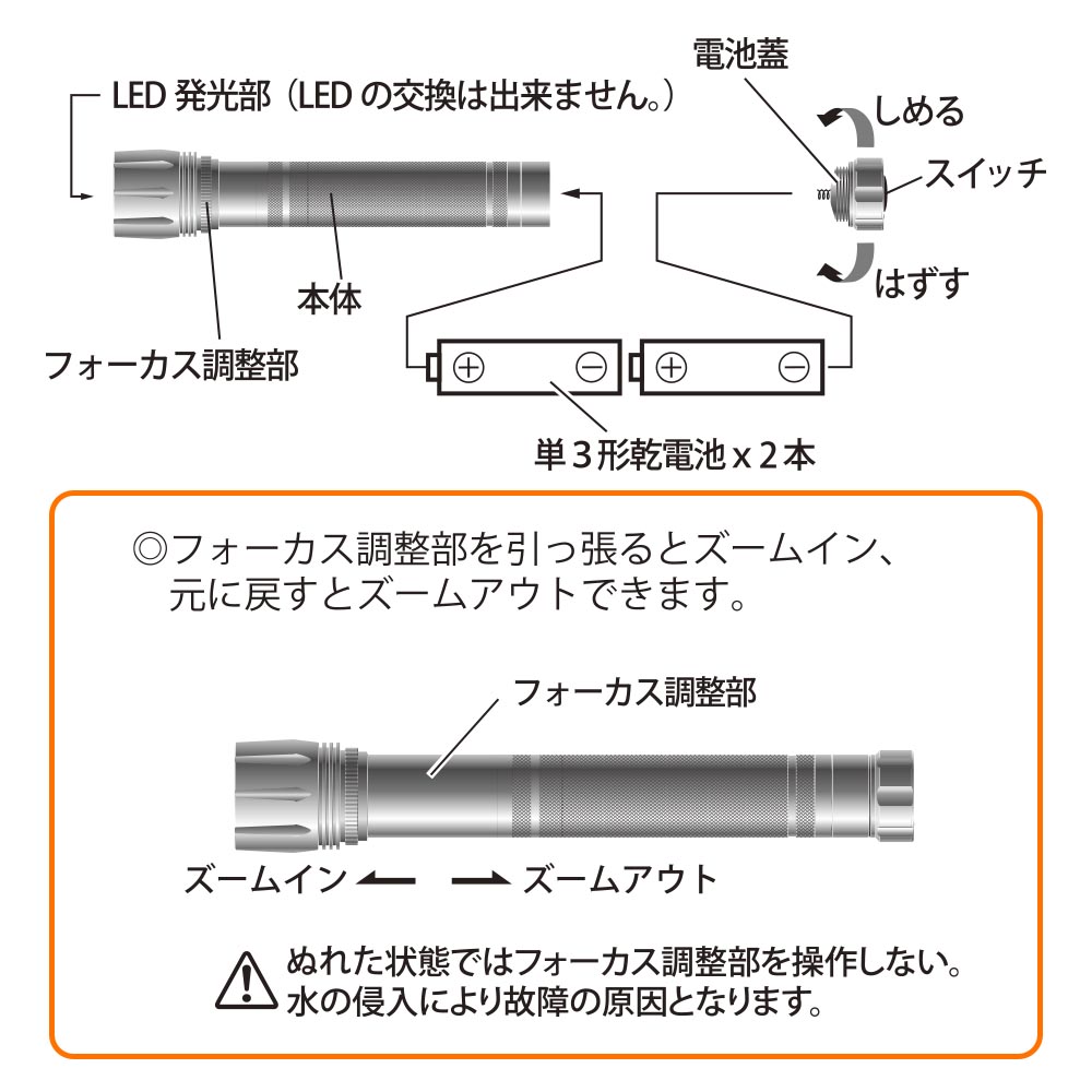 - ● スライドフォーカス機能付き電池式LEDフラッシュライト