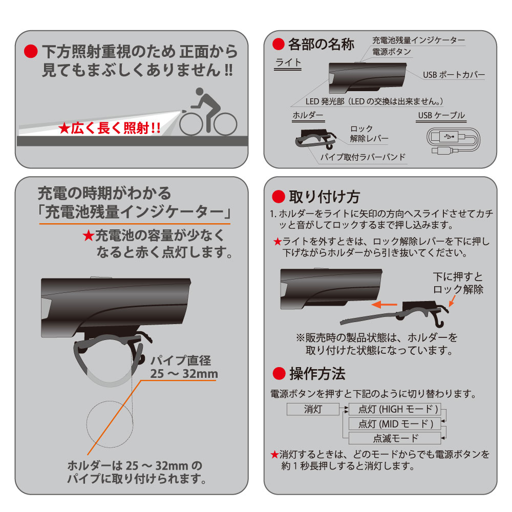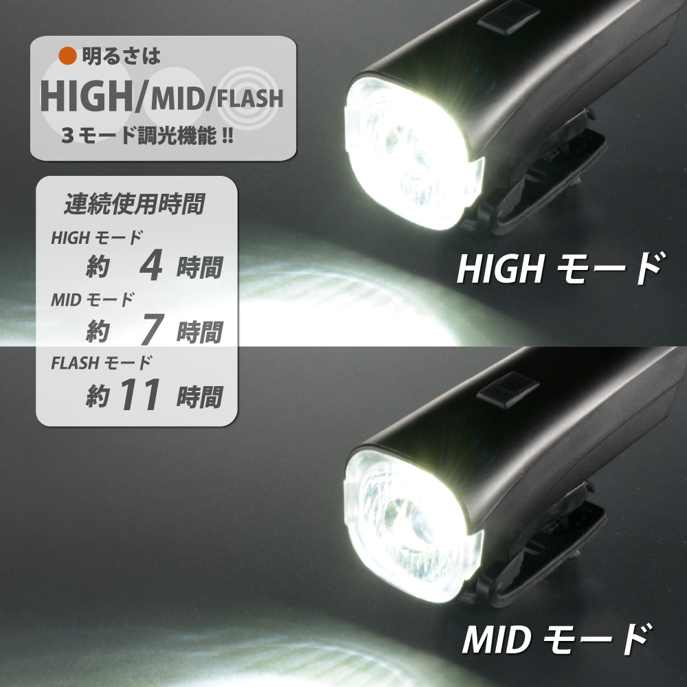 - ● 明るさはHIGH/MID/FLASHの3モード調光機能付き