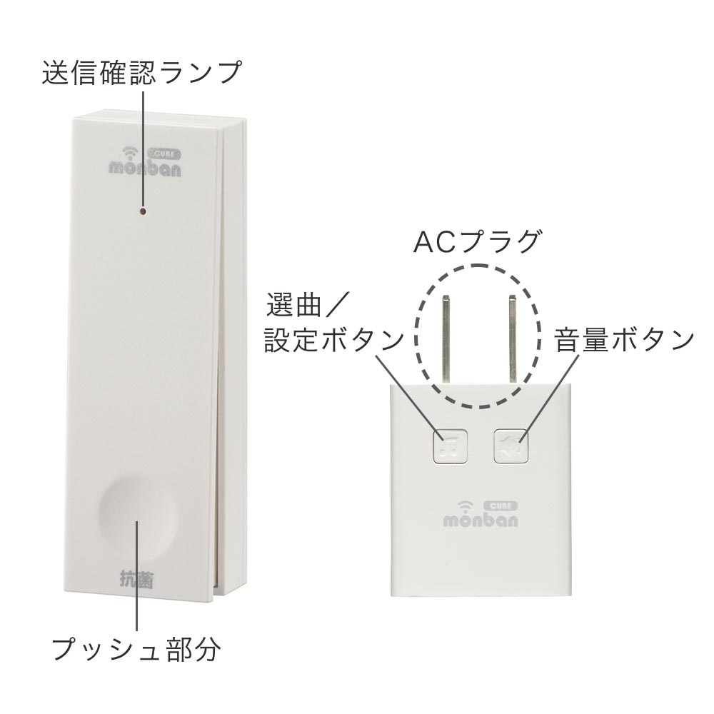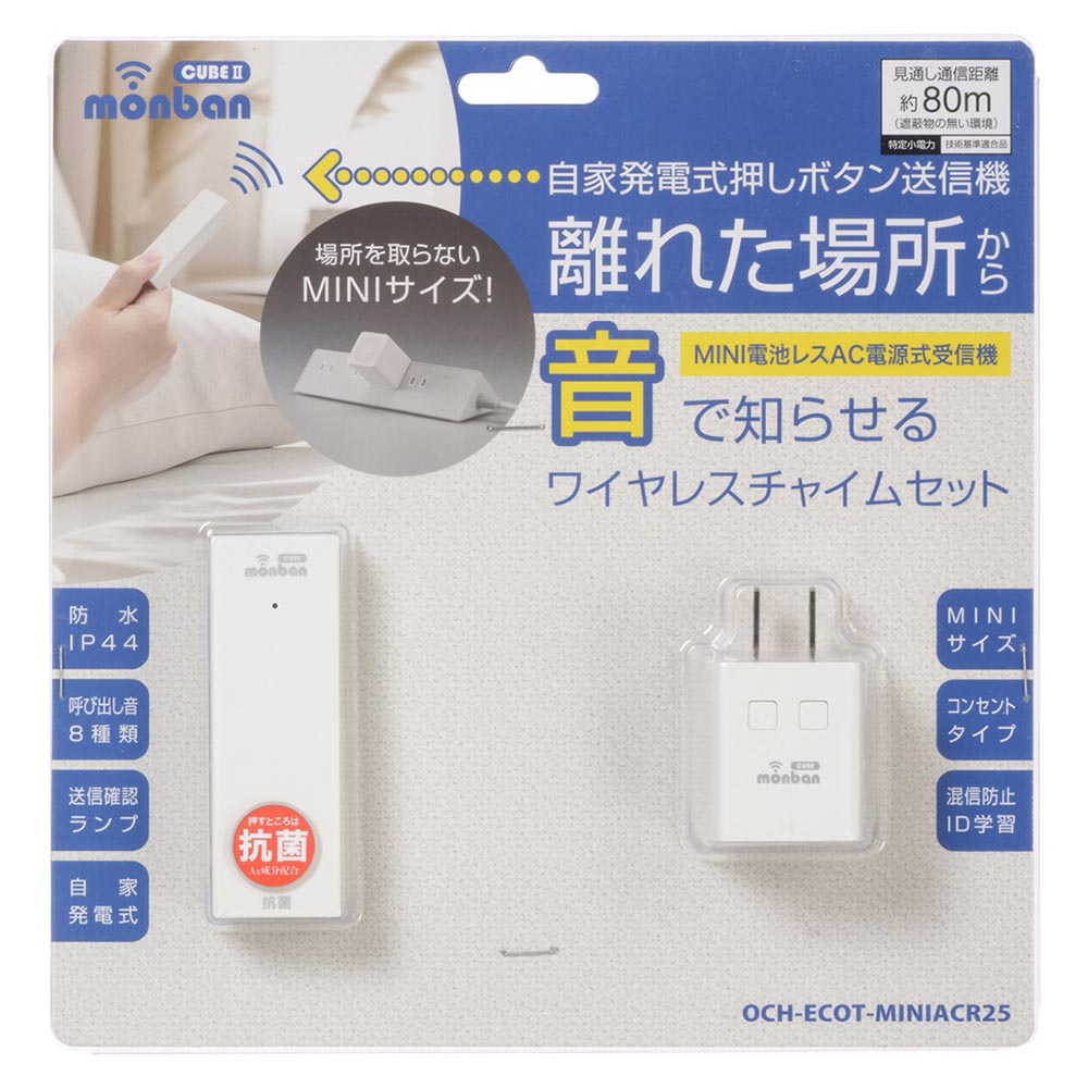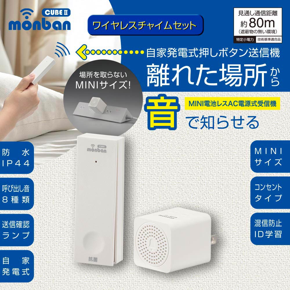 - monban CUBE II ワイヤレスチャイムセット 自家発電式押しボタン送信機+MINI電池レスAC電源式受信機 [品番]08-1901