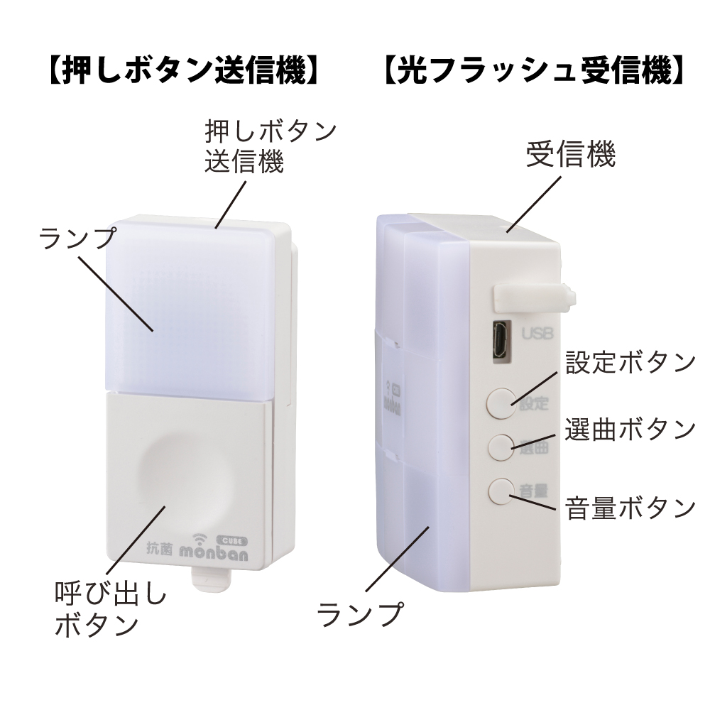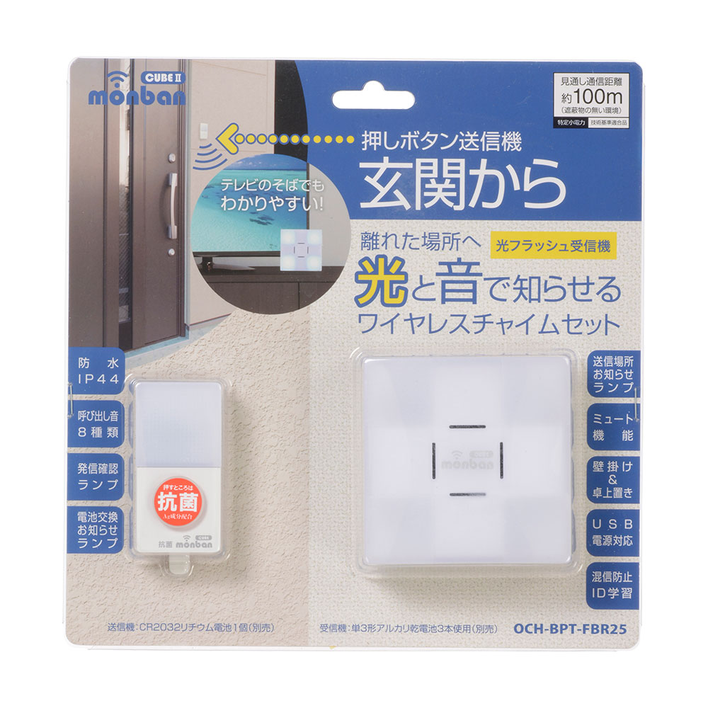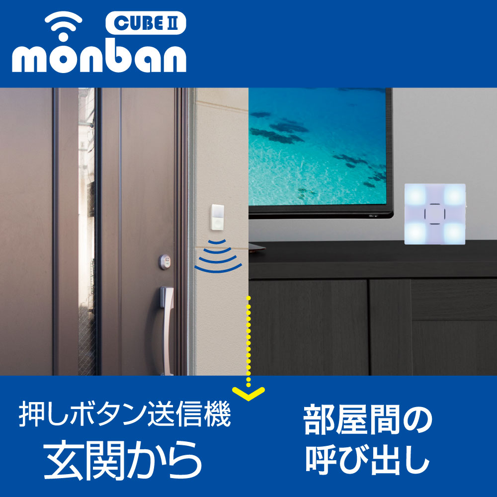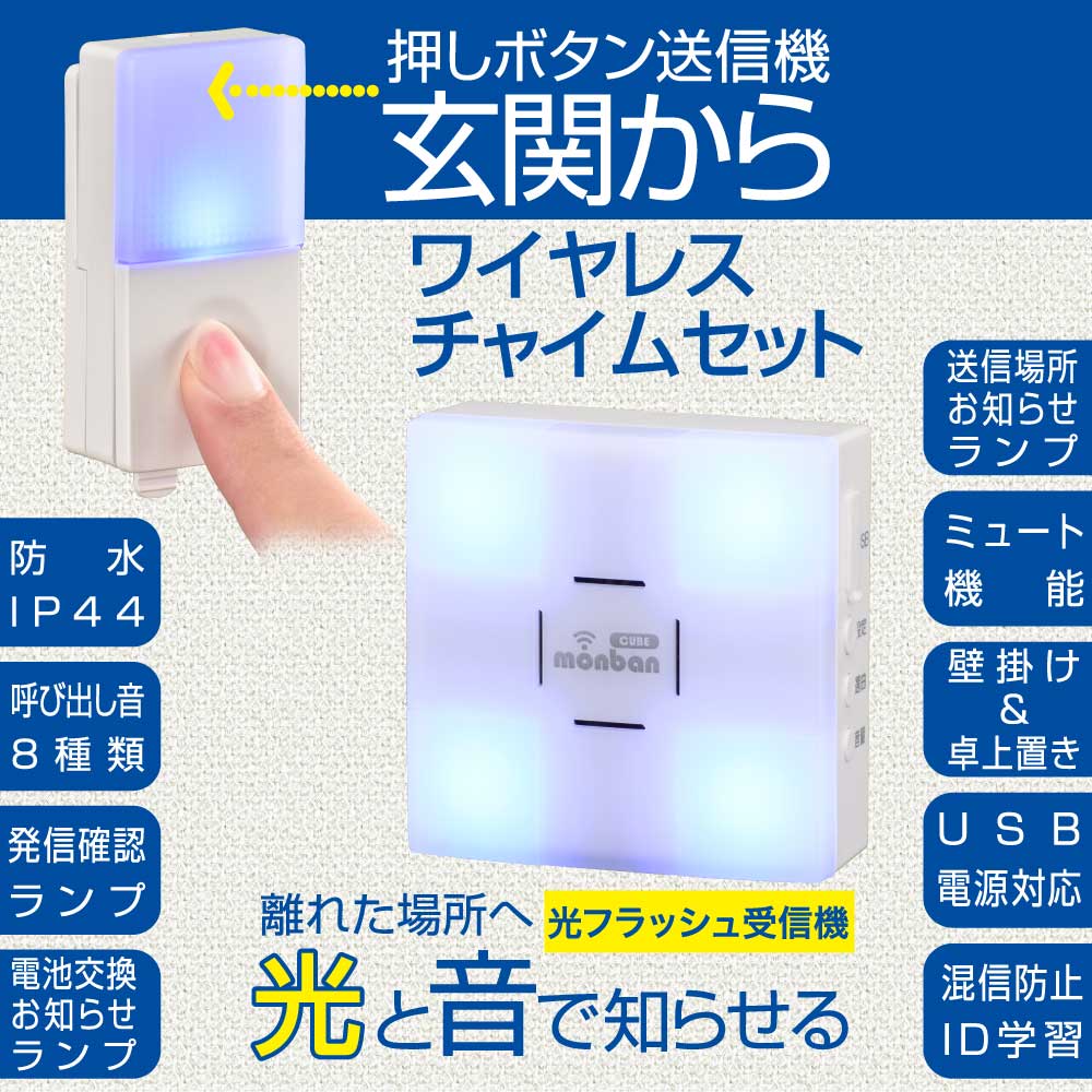 - monban CUBE II ワイヤレスチャイムセット 押しボタン送信機+光フラッシュ電池式受信機 [品番]08-1903