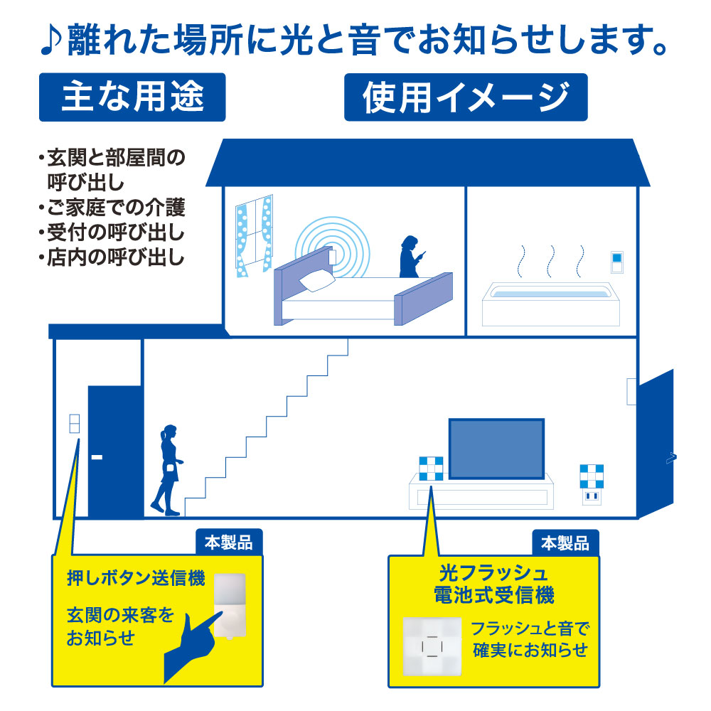 - ● 送信機のボタンを押すと離れた場所に音と光フラッシュでお知らせ