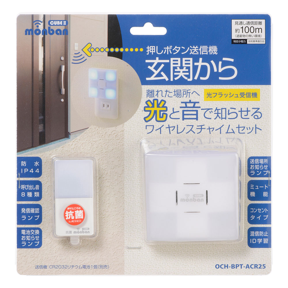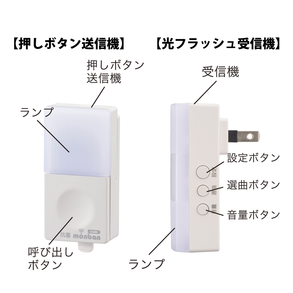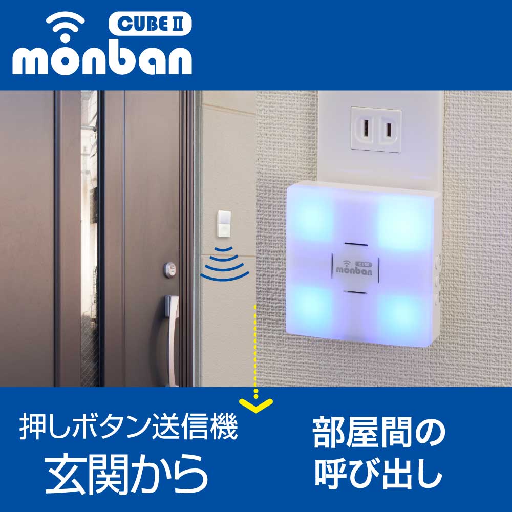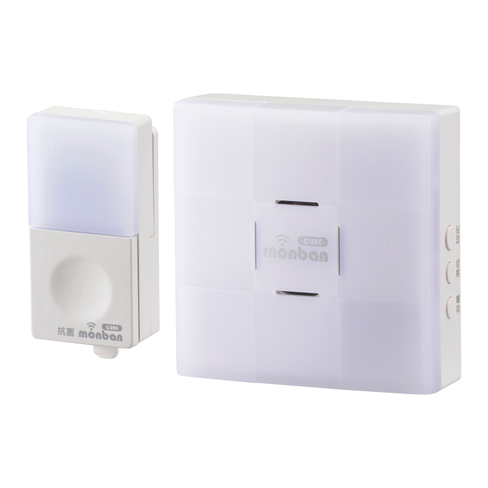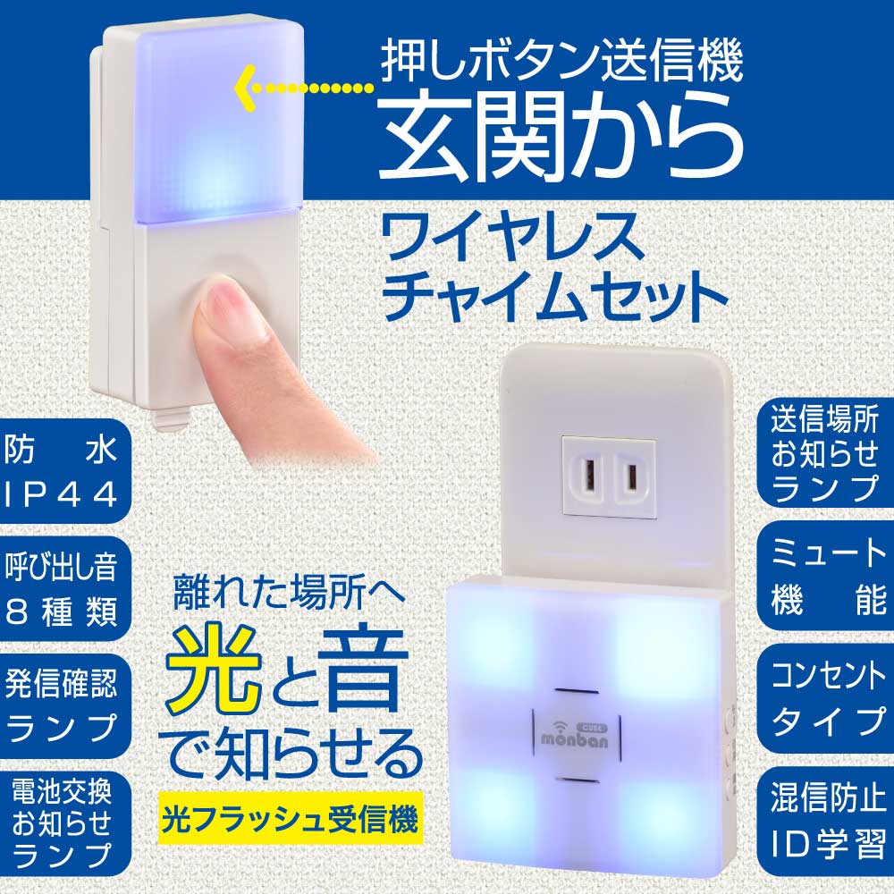 - monban CUBE II ワイヤレスチャイムセット 押しボタン送信機+光フラッシュAC電源式受信機 [品番]08-1904
