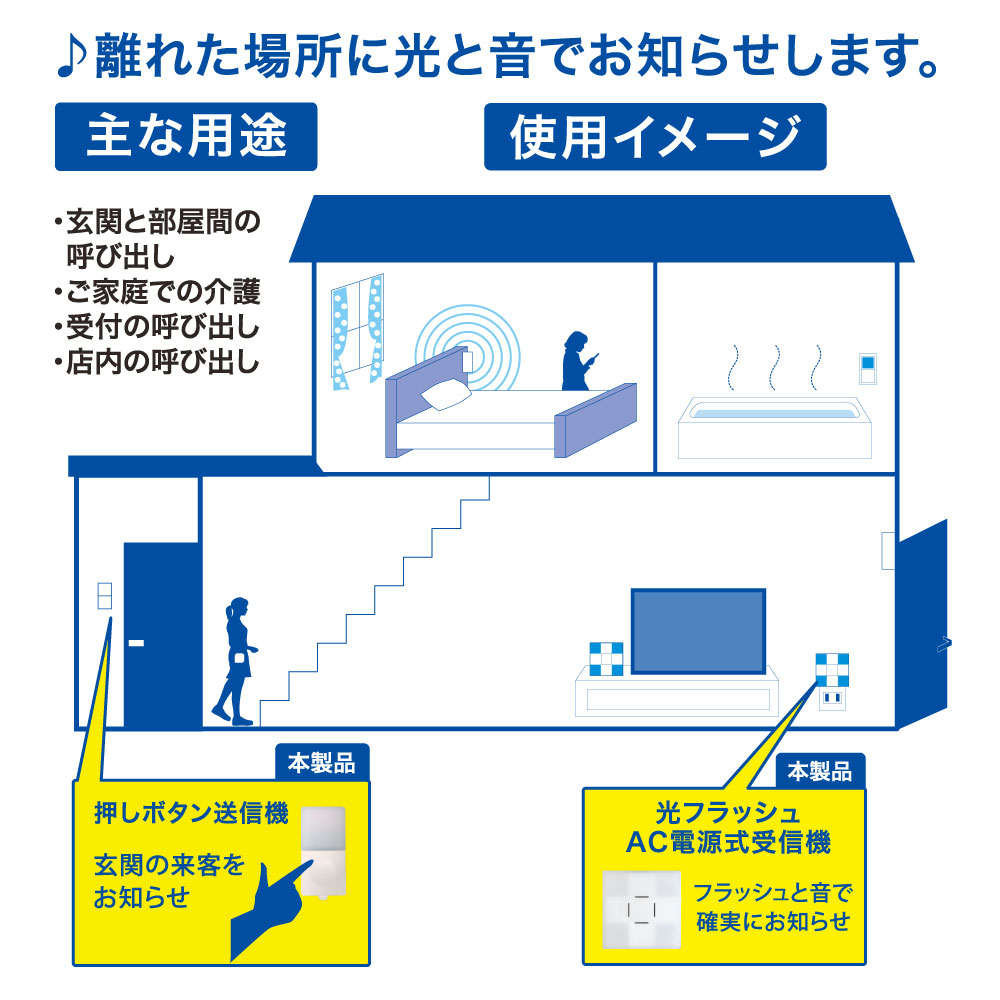 - ● 送信機のボタンを押すと離れた場所に音と光フラッシュでお知らせ