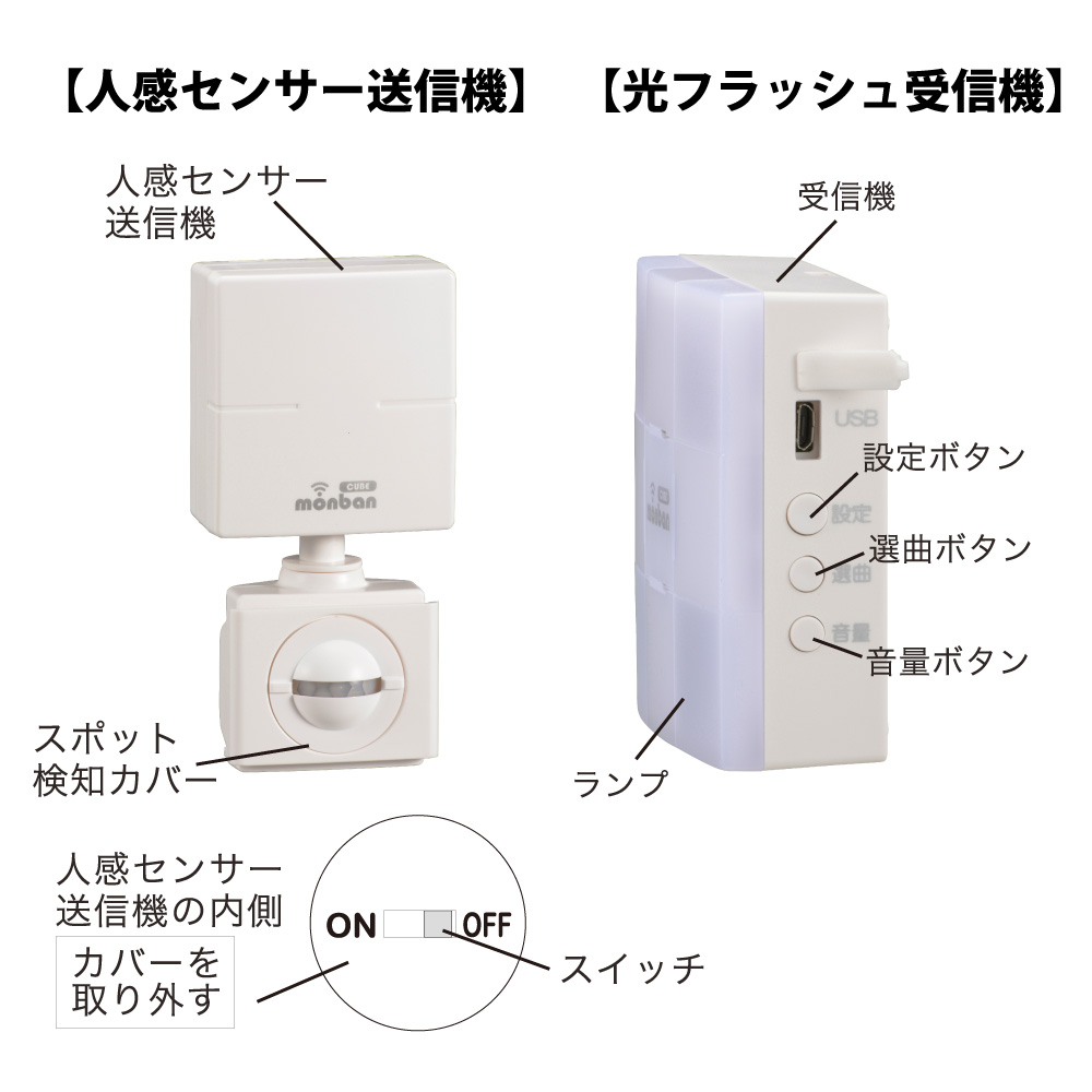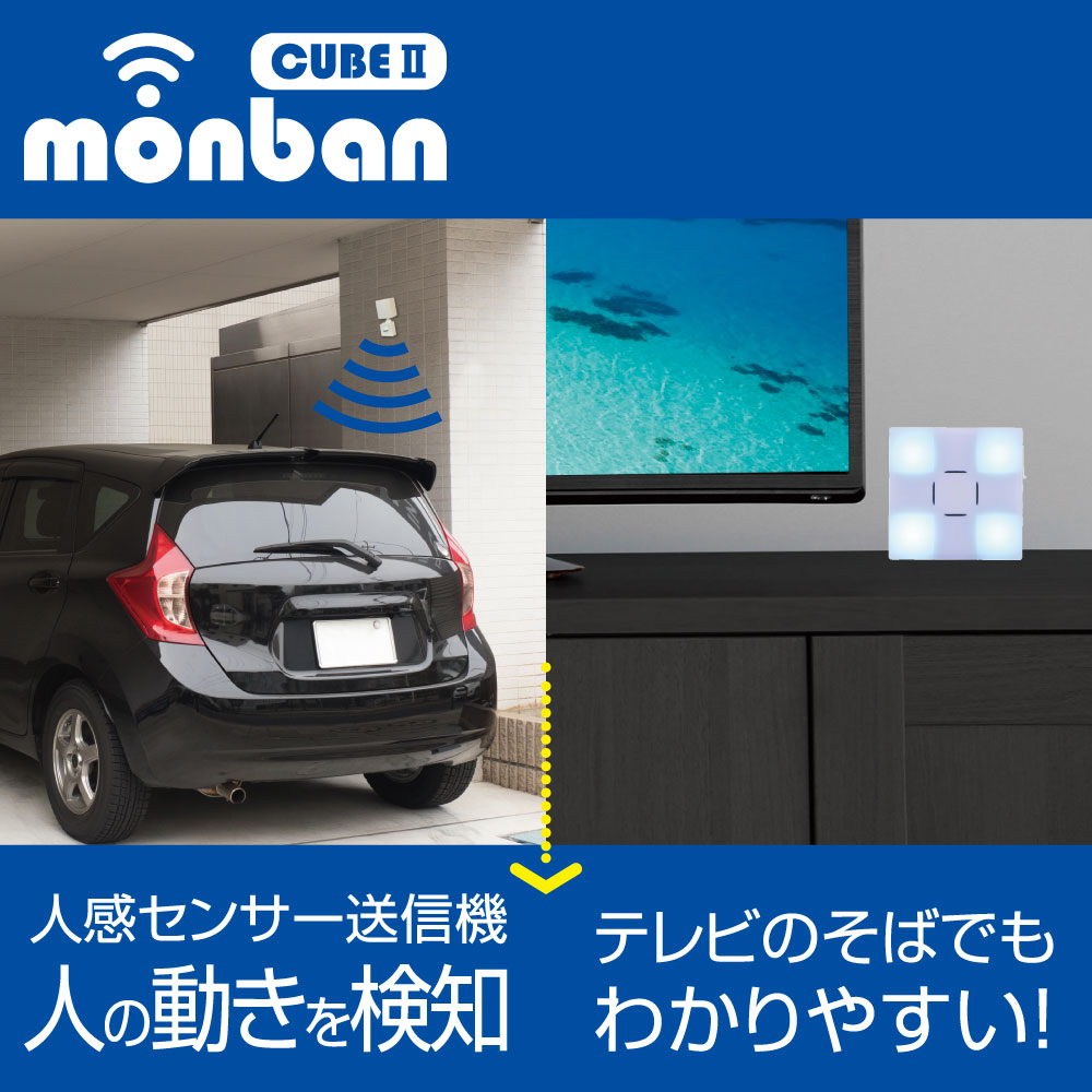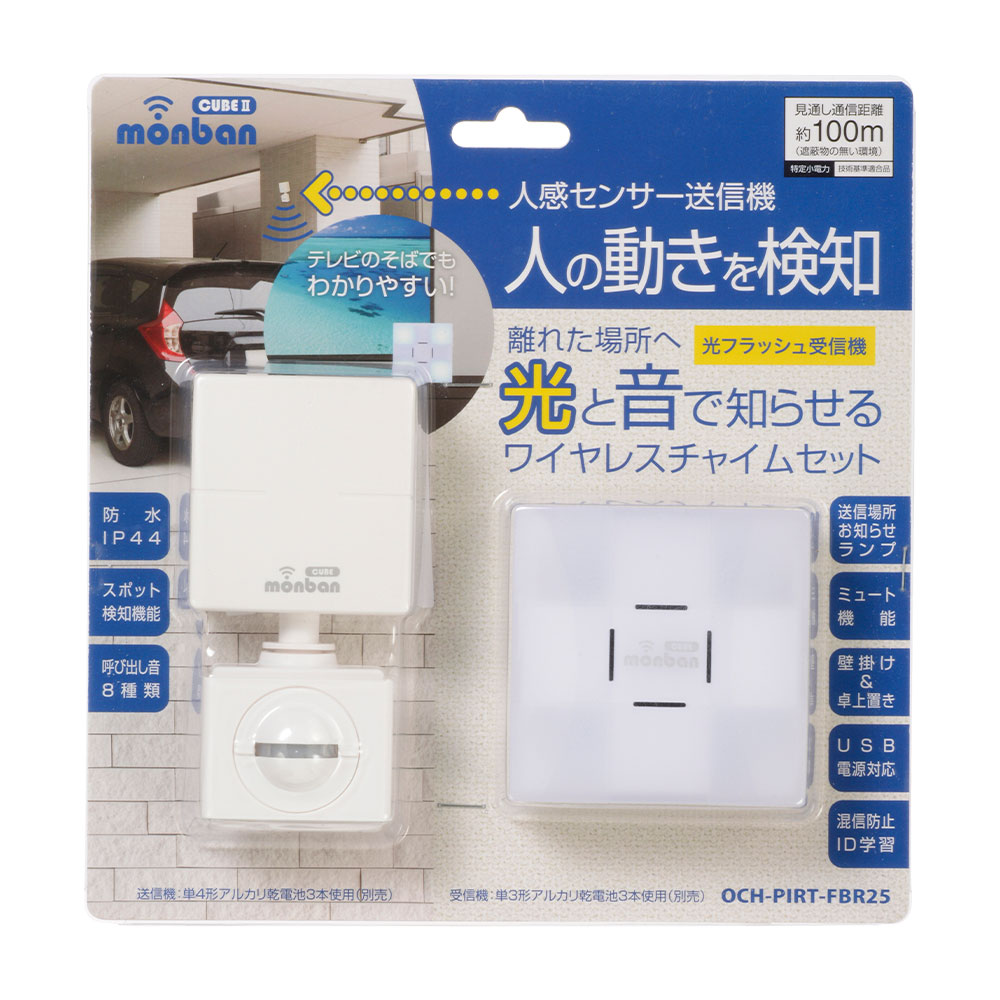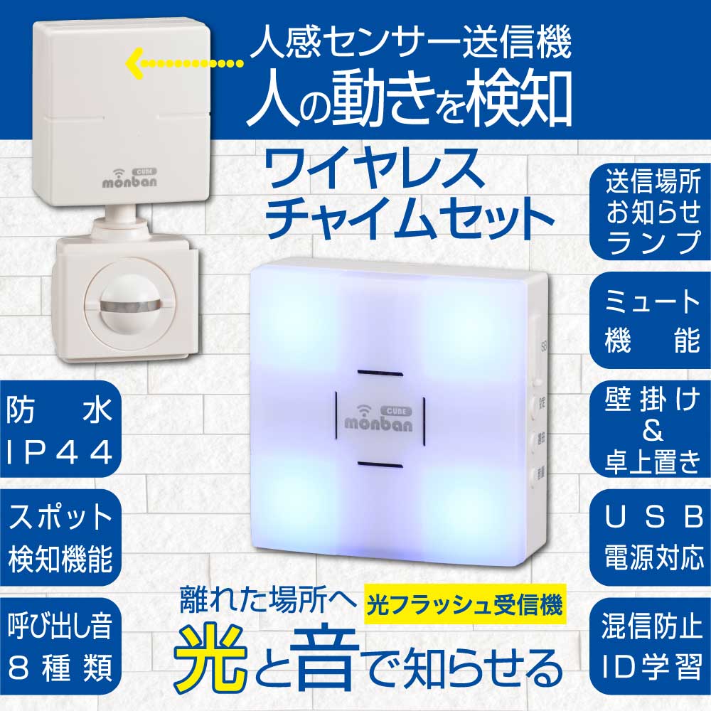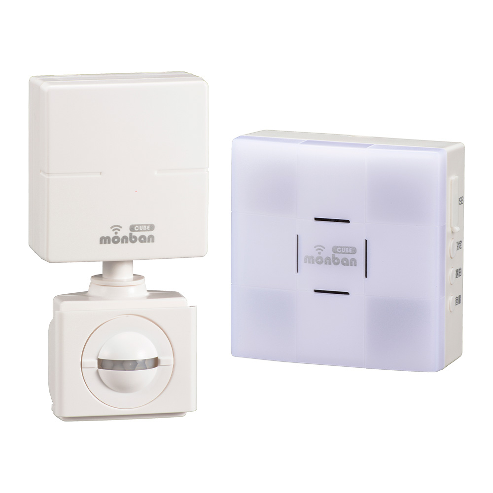 - monban CUBE II ワイヤレスチャイムセット 人感センサー送信機+光フラッシュ電池式受信機 [品番]08-1905