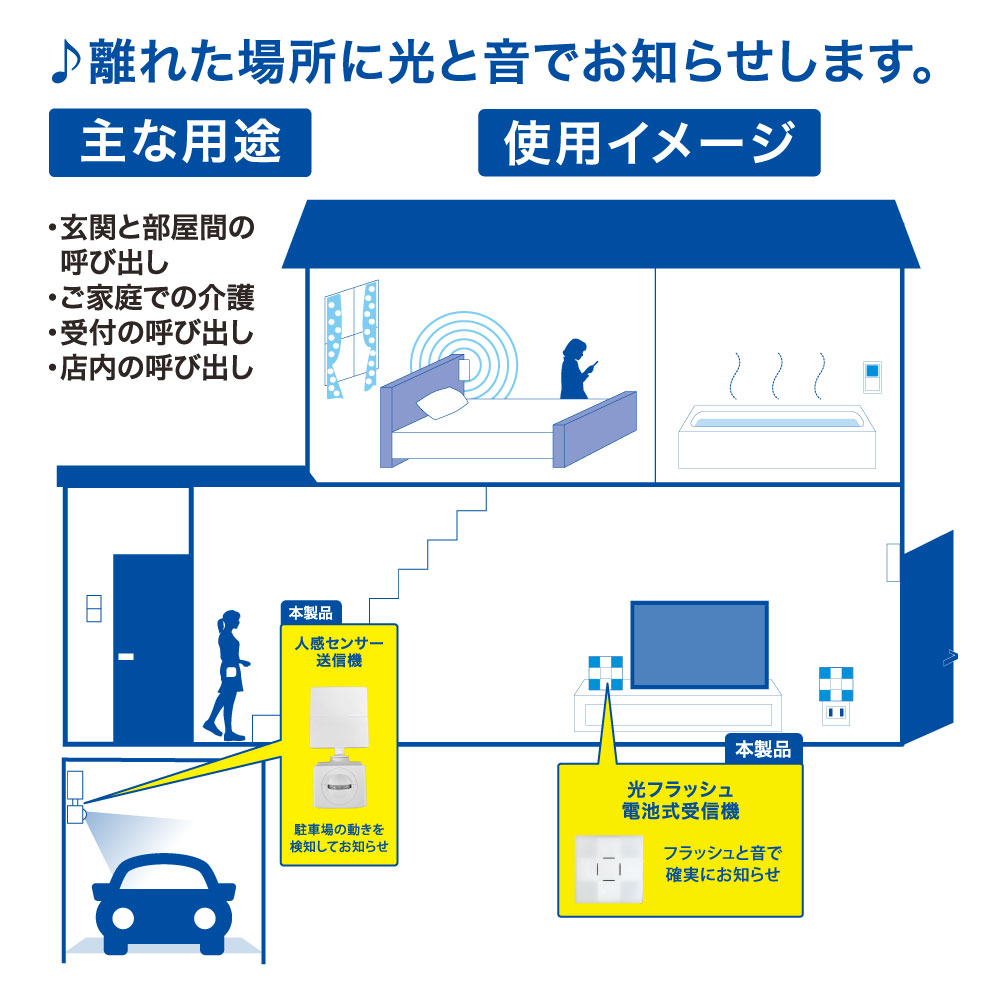 - ● 人の動きを検知して離れた場所に音と光フラッシュでお知らせ