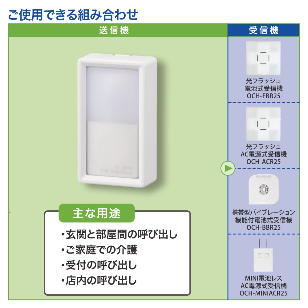 ■ 適合受信機:光フラッシュ電池式受信機(OCH-FBR25)、光フラッシュAC電源式受信機(OCH-ACR25)、携帯型バイブレーション機能付電池式受信機(OCH-BBR25)、MINI電池レスAC電源式受信機(OCH-MINIACR25)