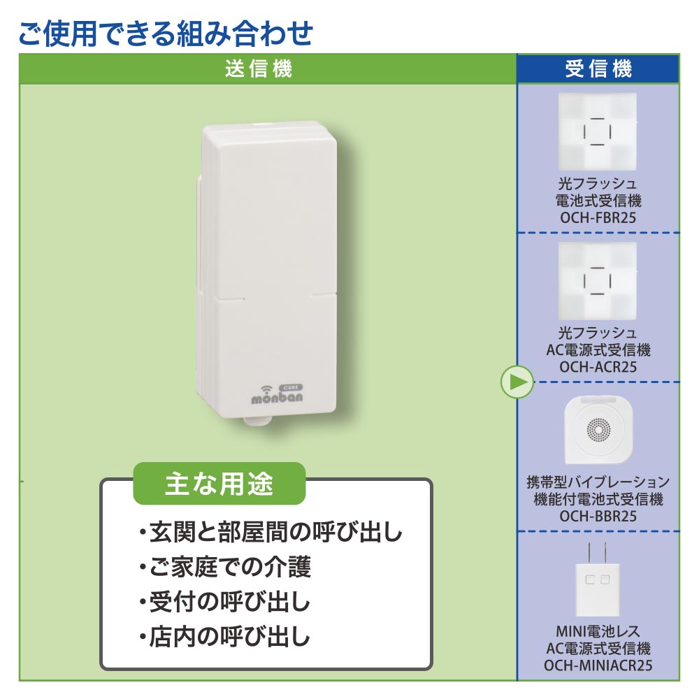 ■ 適合受信機:光フラッシュ電池式受信機(OCH-FBR25)、光フラッシュAC電源式受信機(OCH-ACR25)、携帯型バイブレーション機能付電池式受信機(OCH-BBR25)、MINI電池レスAC電源式受信機(OCH-MINIACR25)