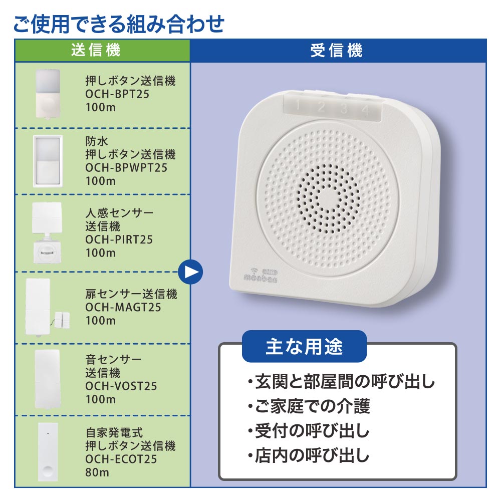 ■ 適合送信機:押しボタン送信機(OCH-BPT25)、防水押しボタン送信機(OCH-BPWPT25)、人感センサー送信機(OCH-PIRT25)、扉センサー送信機(OCH-MAGT25)、音センサー送信機(OCH-VOST25)、自家発電式押しボタン送信機(OCH-ECOT25)