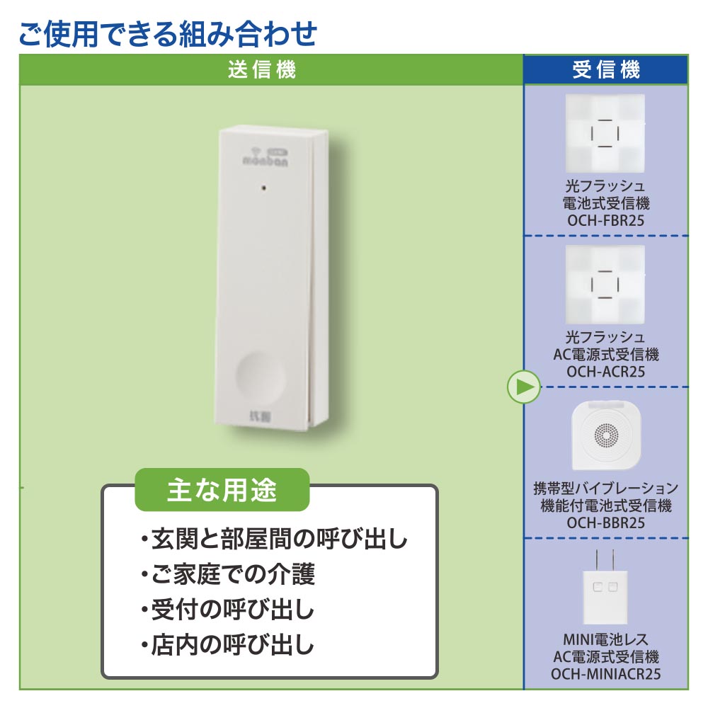 ■ 適合受信機:光フラッシュ電池式受信機(OCH-FBR25)、光フラッシュAC電源式受信機(OCH-ACR25)、携帯型バイブレーション機能付電池式受信機(OCH-BBR25)、MINI電池レスAC電源式受信機(OCH-MINIACR25)