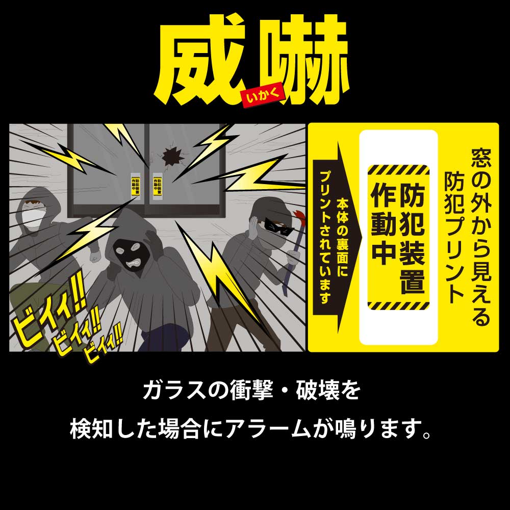 - ● 本体の裏面にプリントされた「防犯装置作動中」、窓の外から見えます