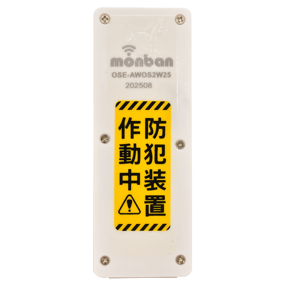 - ● 本体の裏面にプリントされた「防犯装置作動中」、窓の外から見えます。