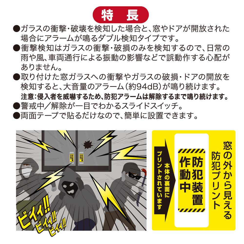 - ● 取り付けた窓ガラスへの衝撃や破損・ドアの開放を検知すると、大音量のアラーム(約94dB)が鳴り続けます。(注:侵入者を威嚇するため、防犯アラームは解除するまで鳴り続けます。)