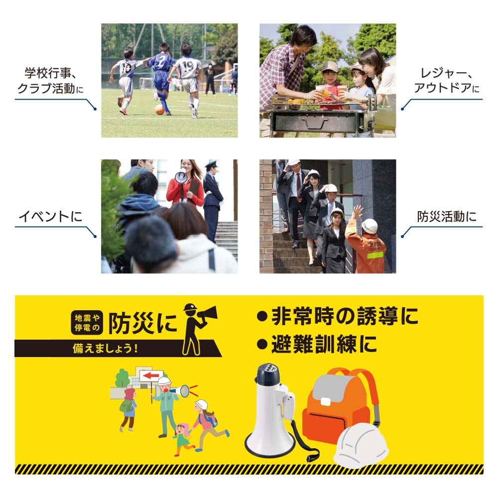 - ● イベントやレジャー、アウトドア、防災に活躍するハンディメガホン