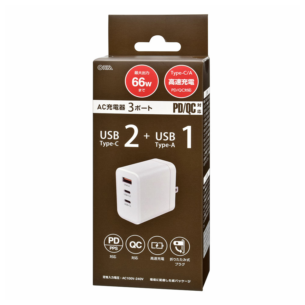 - AC充電器 3ポート Type-C/A PD/QC対応 66W [品番]01-7307