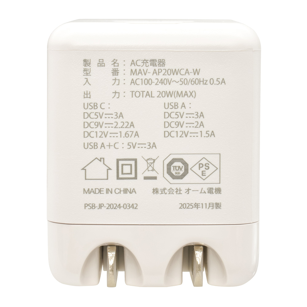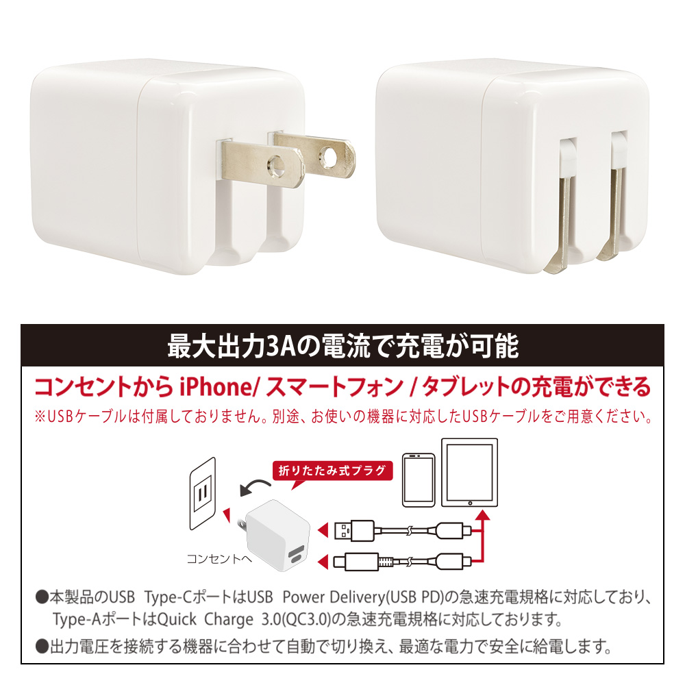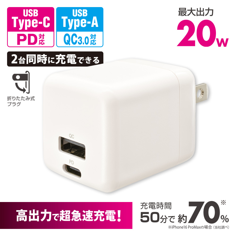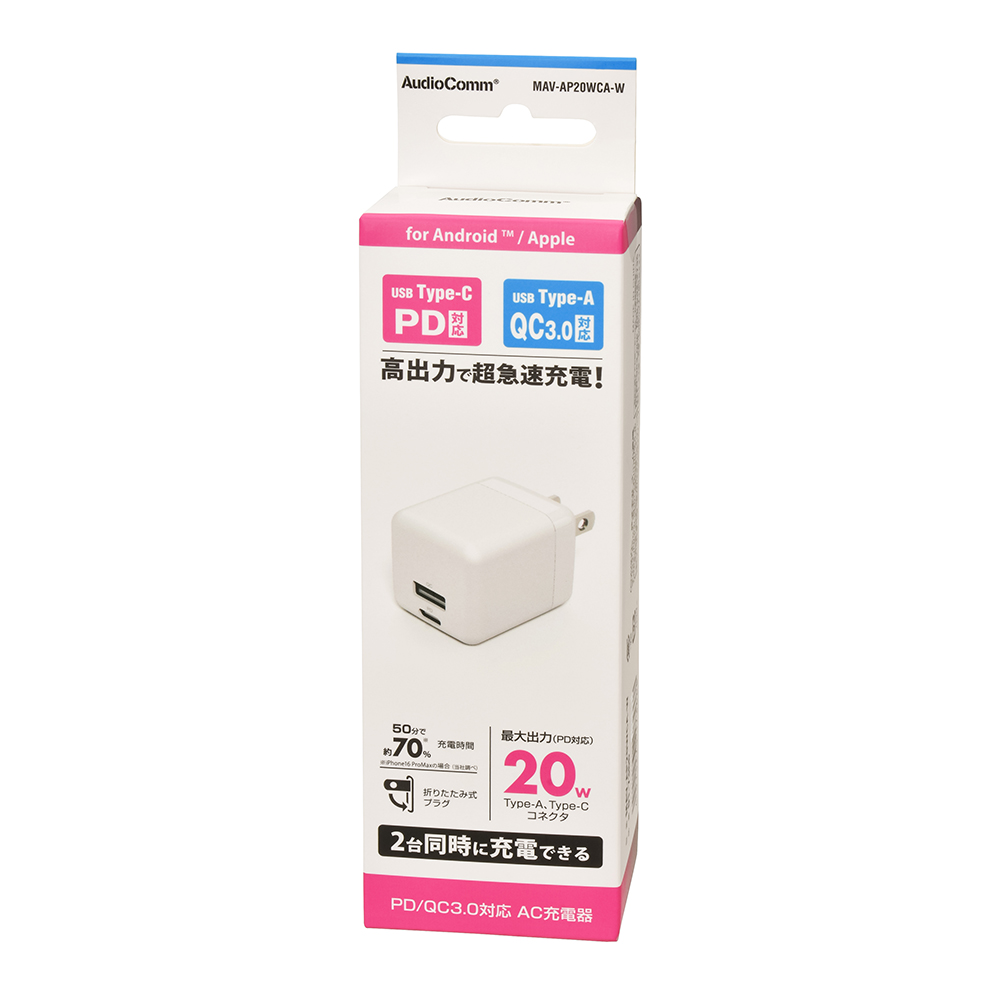 - AudioComm PD/QC対応 AC充電器 Type-C/A 20W [品番]01-7366