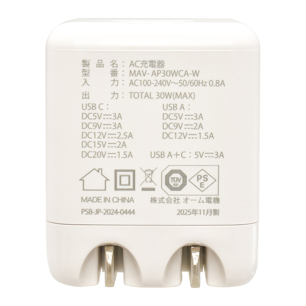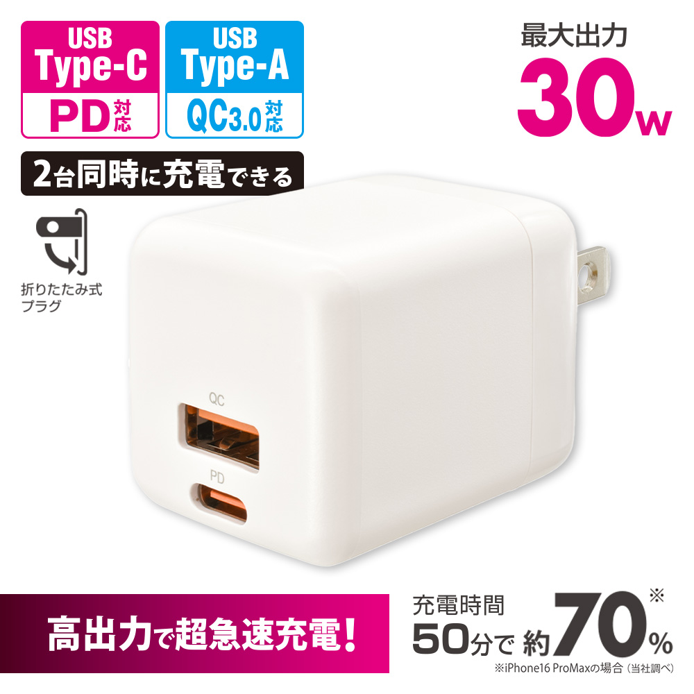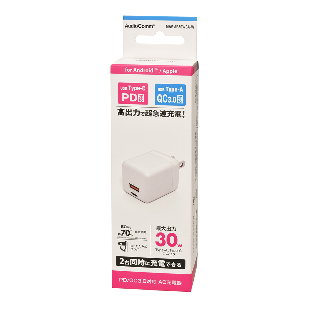 - AudioComm PD/QC対応 AC充電器 Type-C/A 30W [品番]01-7367