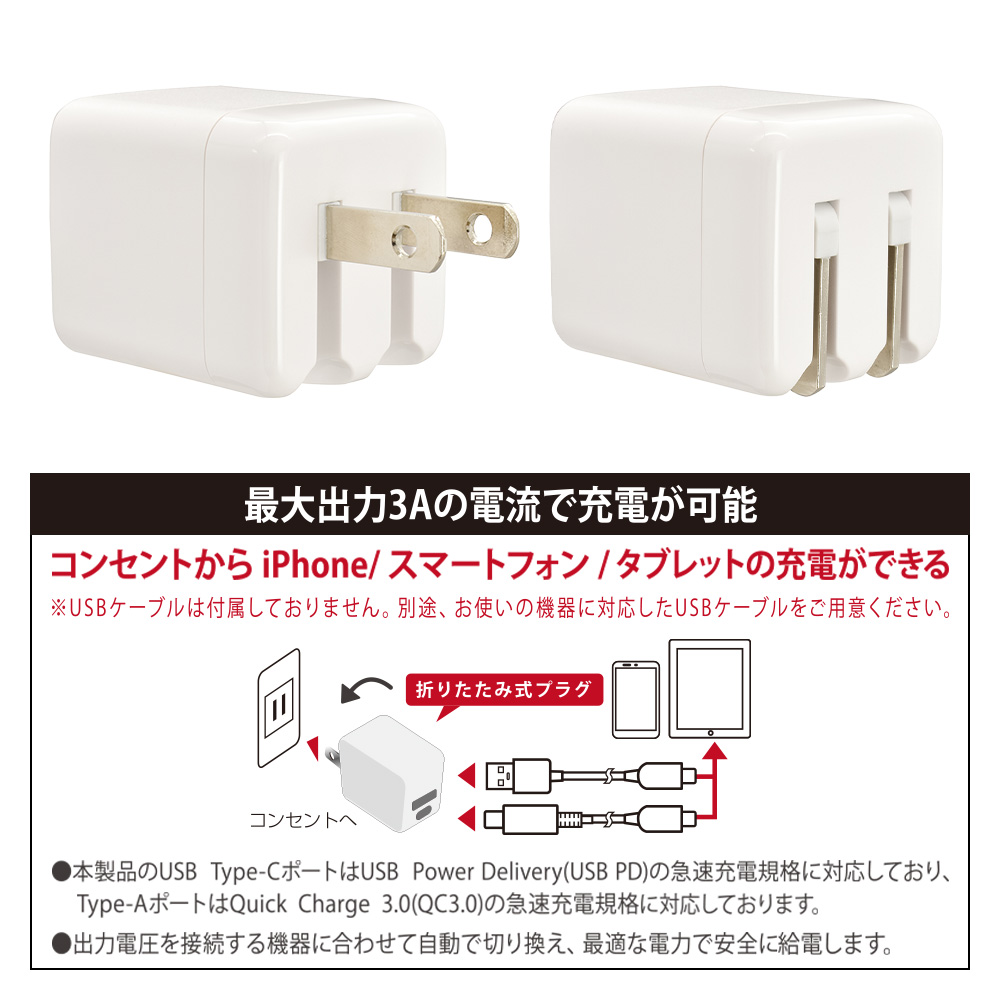 - ● お手持ちのUSBケーブルで家庭用コンセントからiPhone/スマートフォン/タブレットの充電が2台同時にできる、USB2ポートのAC充電器