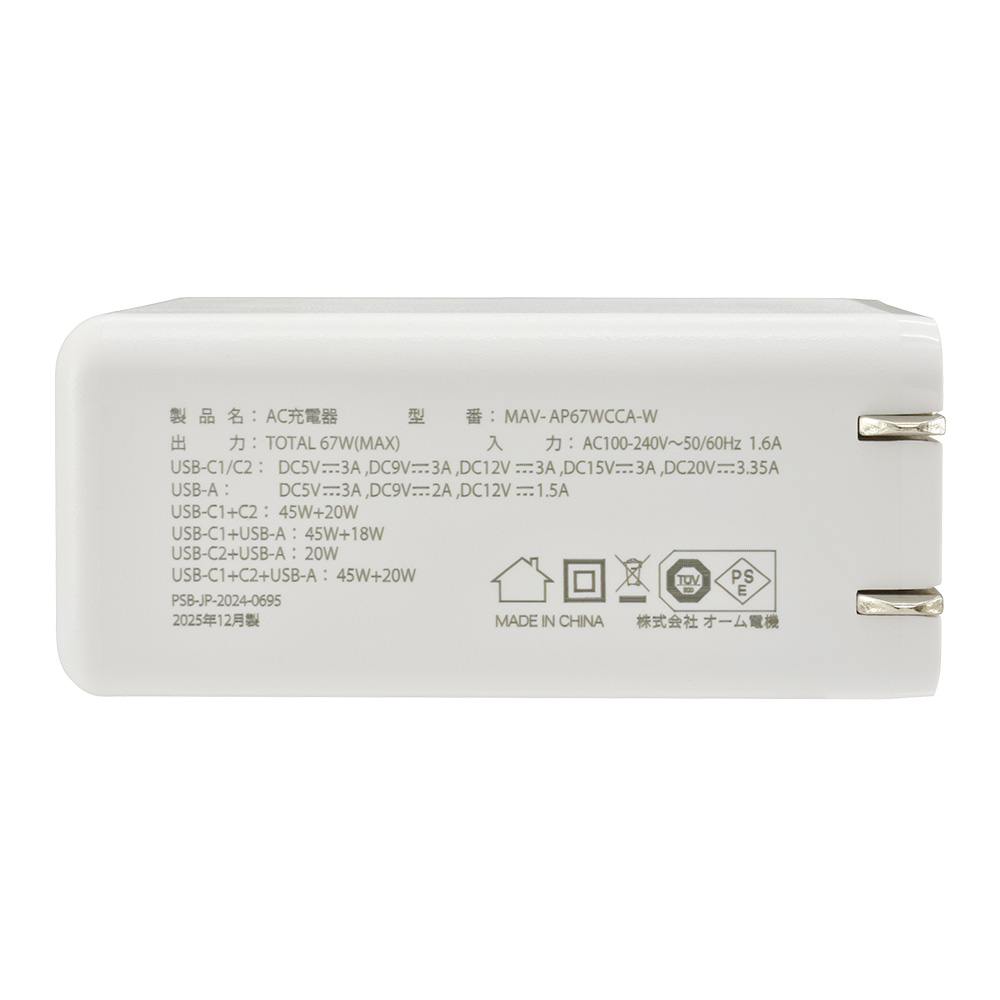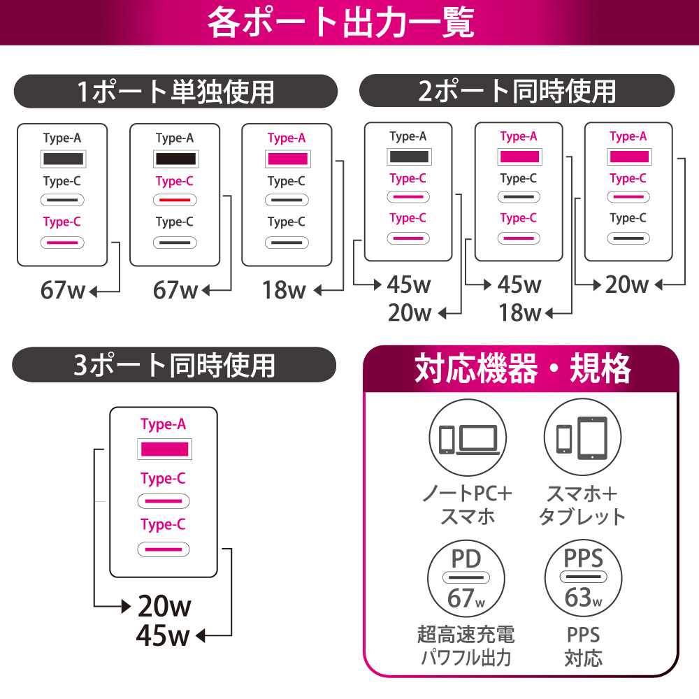 ■ Type-C1+Type-C2+Type-A:45W+20W※充電環境により供給電流値は異なります。