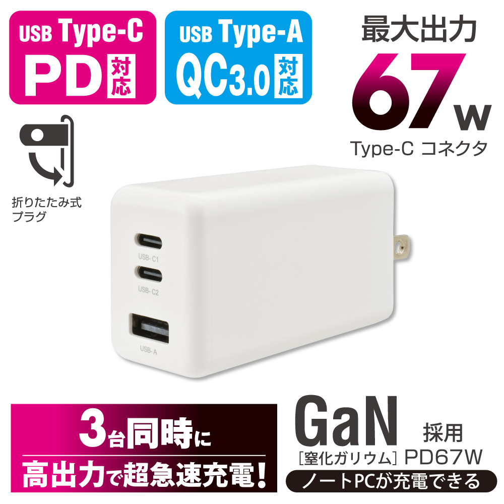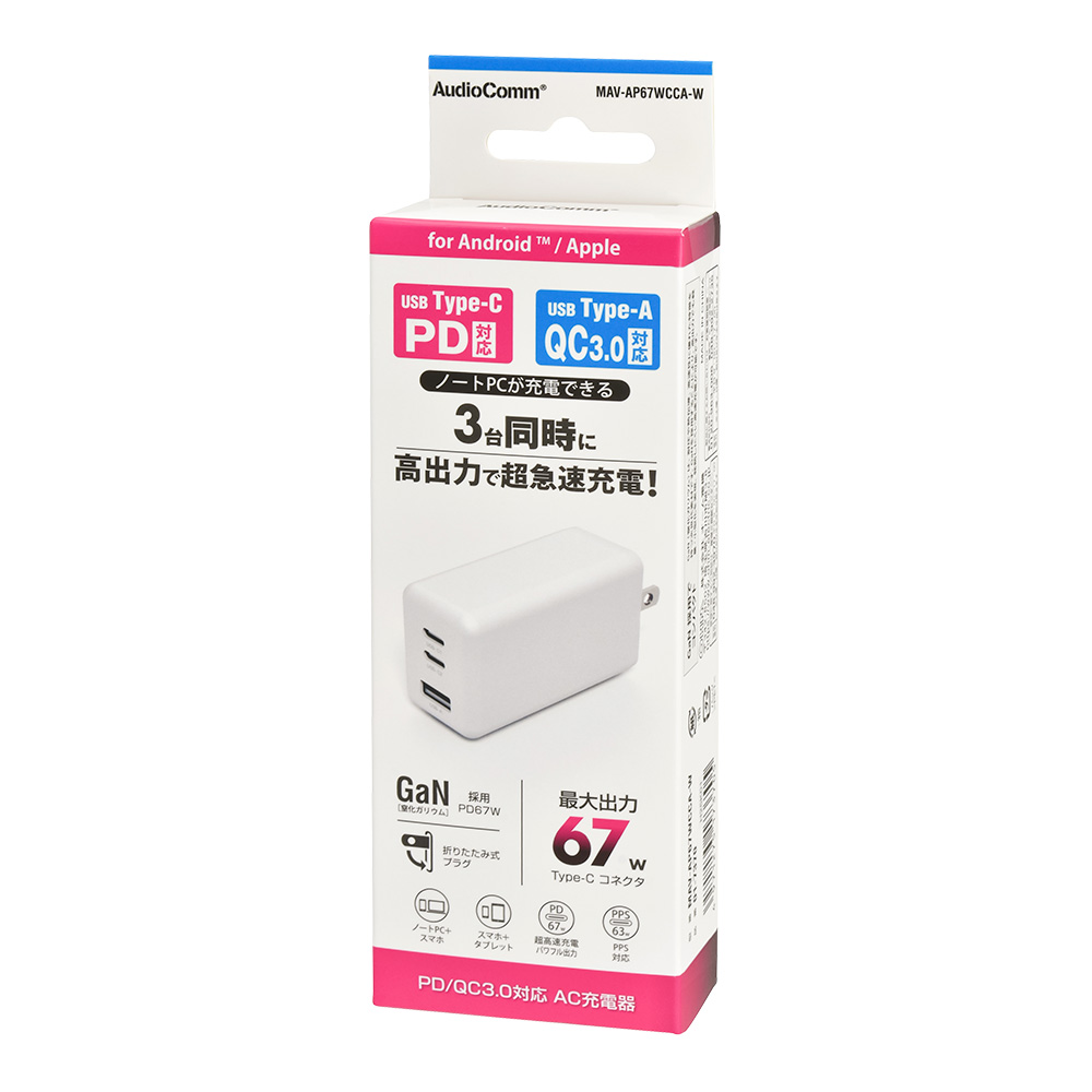 - AudioComm PD/QC3.0対応 AC充電器(Type-A+Type-C×2搭載) [品番]01-7370