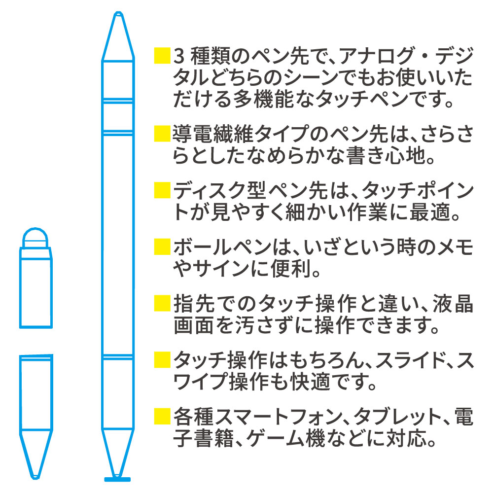 - ● 3種類のペン先で、アナログ・デジタルどちらのシーンでもお使いいただける多機能なタッチペン