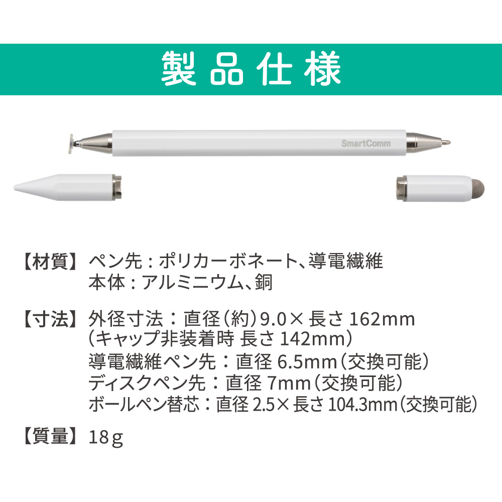 ■ 寸法:外径寸法…直径(約)9.0×長さ162mm(キャップ非装着時長さ142mm)、導電繊維ペン先…直径6.5mm(交換可能)、ディスクペン先…直径7mm(交換可能)、ボールペン替芯…直径2.5×長さ104.3mm(交換可能)