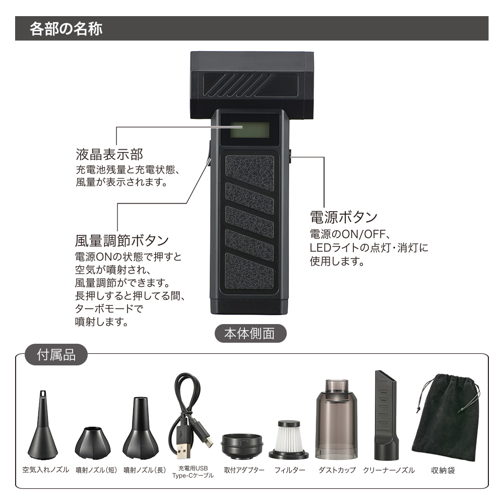 ■ 付属品:噴射ノズル(短)×1、噴射ノズル(長)×1、空気入れノズル×1、クリーナーノズル×1、ダストカップ×1、フィルター×1、取付アダプター×1、充電用USB Type-Cケーブル(長さ:約25cm)、収納袋×1、保証書付取扱説明書