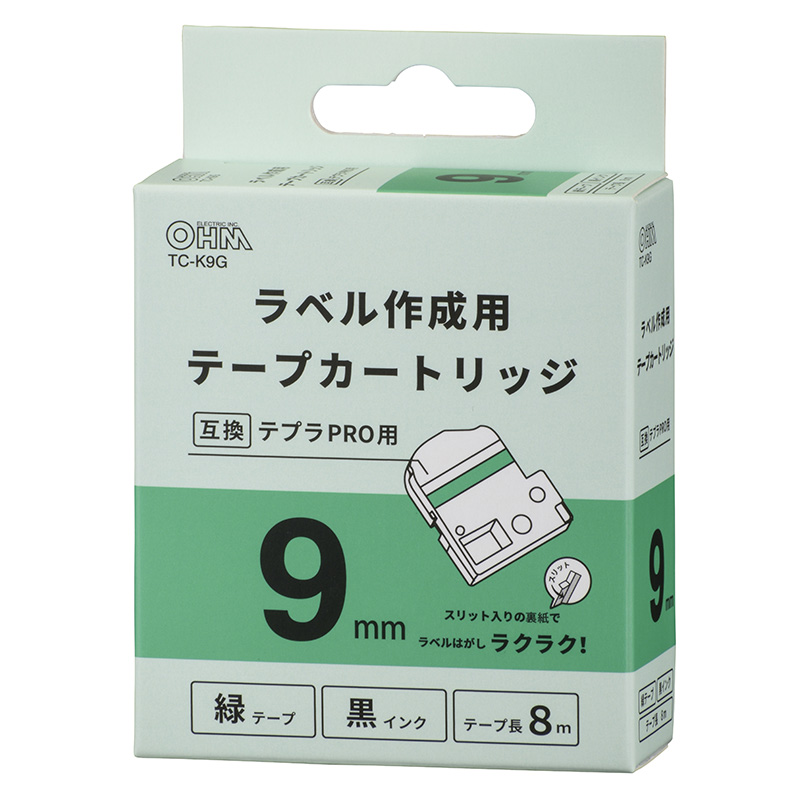テプラ互換ラベル 緑テープ 黒文字 幅9mm [品番]01-3820