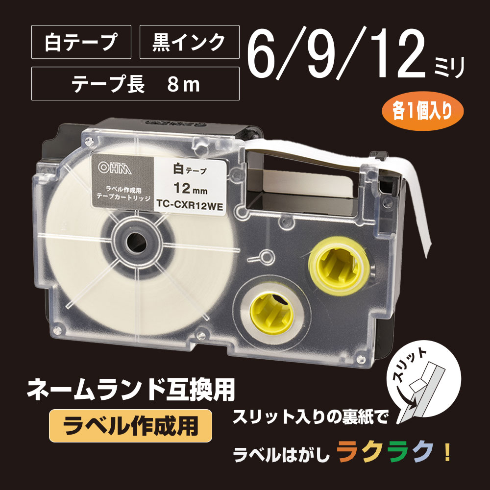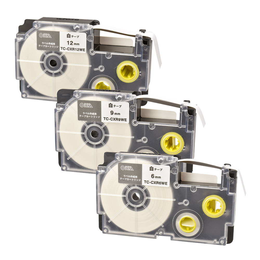 - テープカートリッジ 6/9/12ミリ 白テープ 黒インク 各1個入 [品番]01-7815